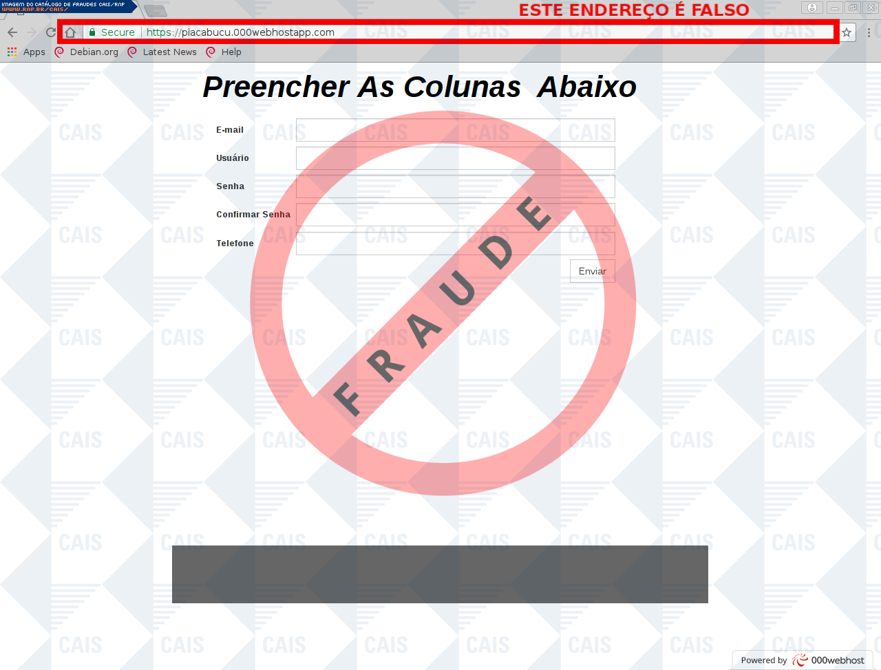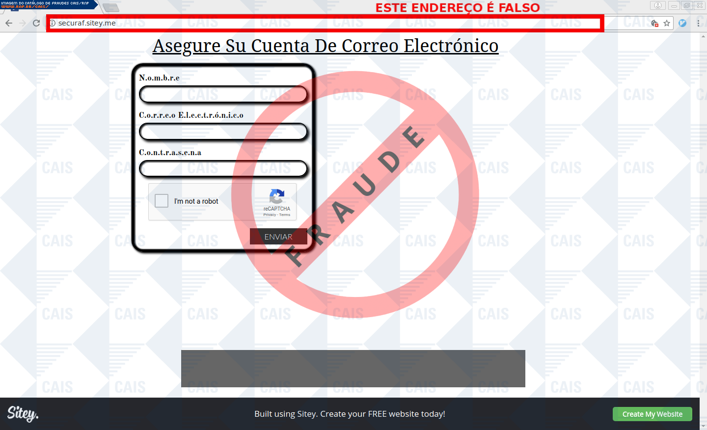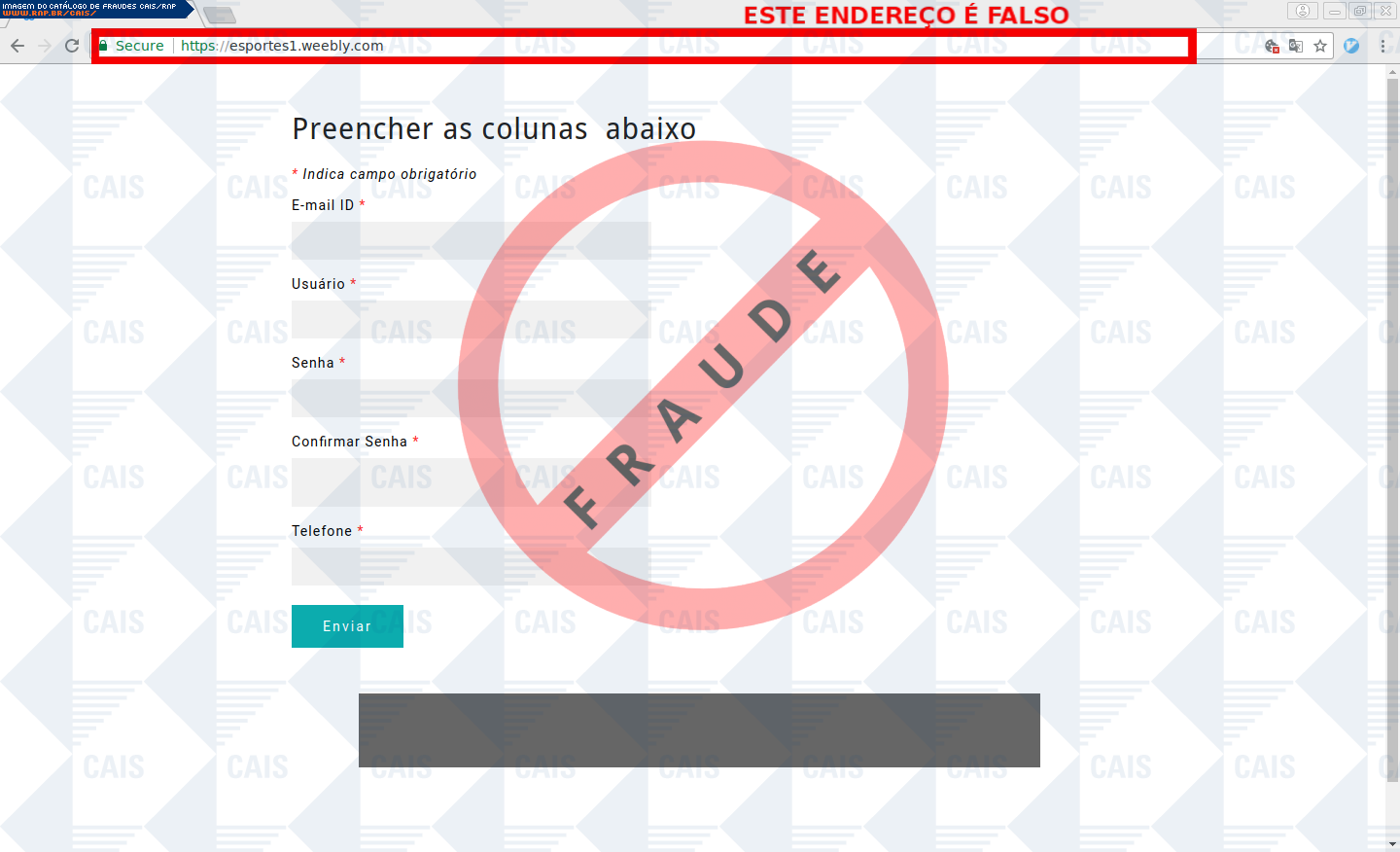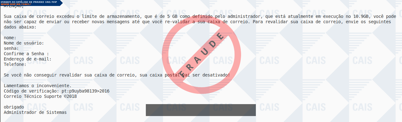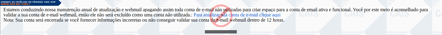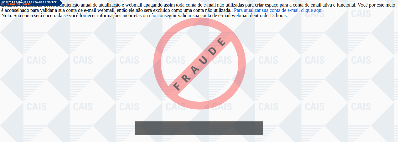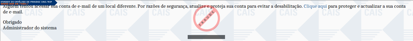 Esta página tem função informativa e educativa. Exibe uma coleção de imagens de phishing scam (fraudes eletrônicas) ou malware (código malicioso) veiculados por meio de spam (e-mail não-solicitado). Trata-se de conteúdo exemplificativo, não exaustivo, uma vez que não é possível contemplar todos os casos de fraudes existentes. Assim, caso você tenha conhecimento de um exemplar que não esteja aqui presente, isto não significa que não seja válido ou real. Inclusive incentivamos que você o envie para análise do CAIS para que, se for o caso, passe a integrar o nosso acervo.
