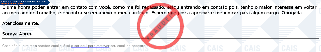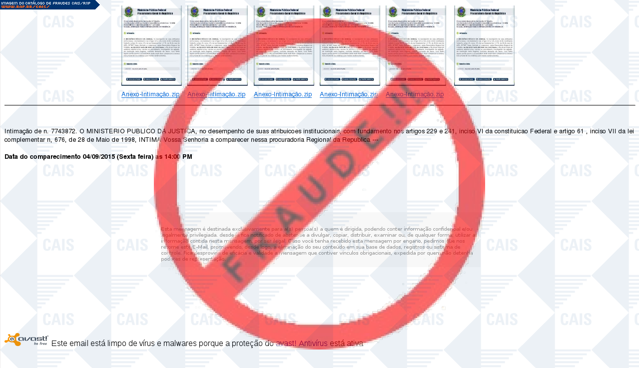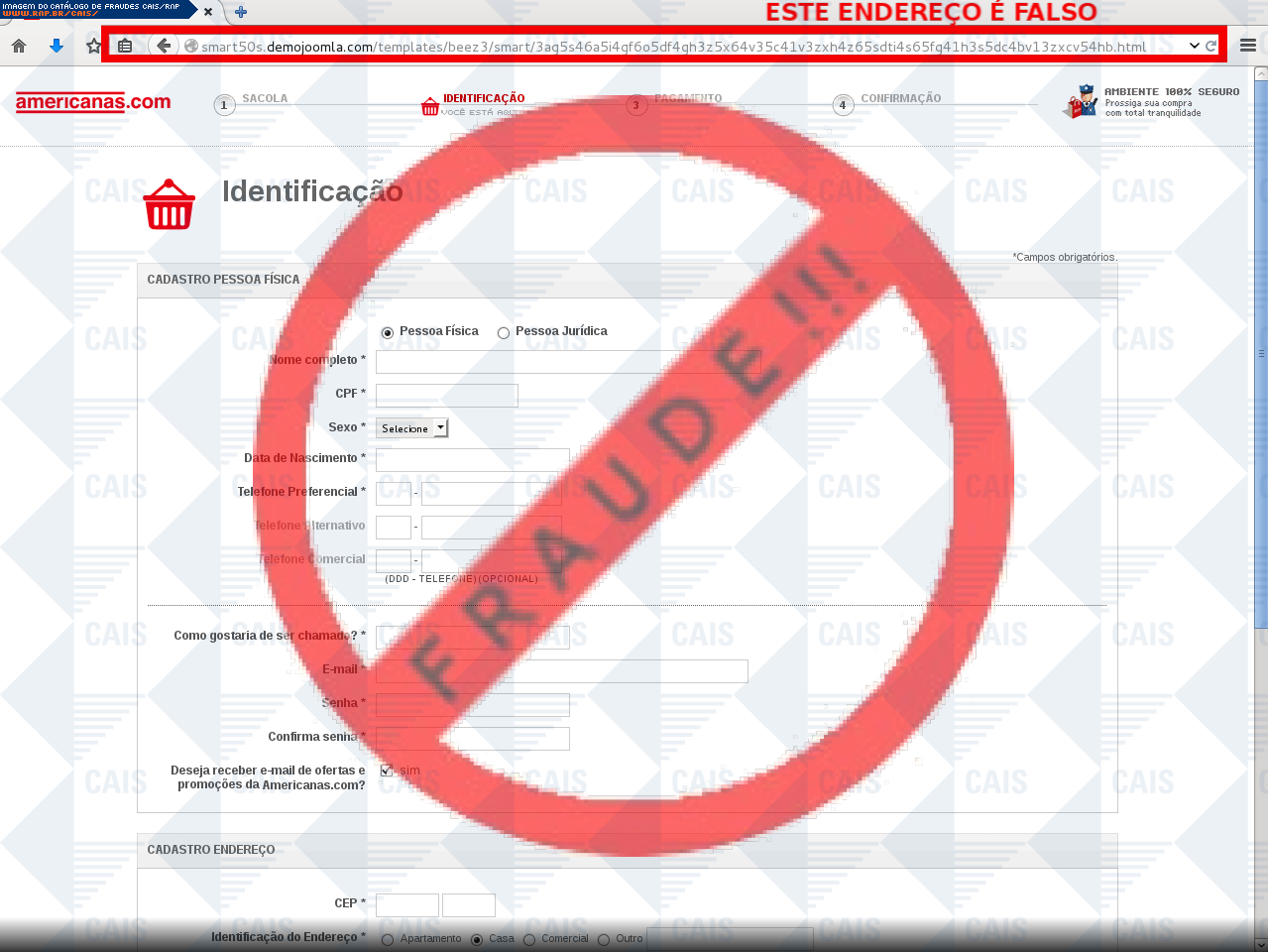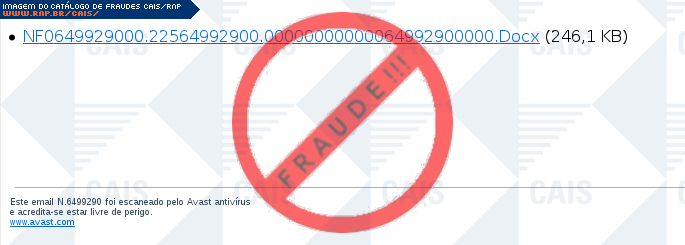 Esta página tem função informativa e educativa. Exibe uma coleção de imagens de phishing scam (fraudes eletrônicas) ou malware (código malicioso) veiculados por meio de spam (e-mail não-solicitado). Trata-se de conteúdo exemplificativo, não exaustivo, uma vez que não é possível contemplar todos os casos de fraudes existentes. Assim, caso você tenha conhecimento de um exemplar que não esteja aqui presente, isto não significa que não seja válido ou real. Inclusive incentivamos que você o envie para análise do CAIS para que, se for o caso, passe a integrar o nosso acervo.