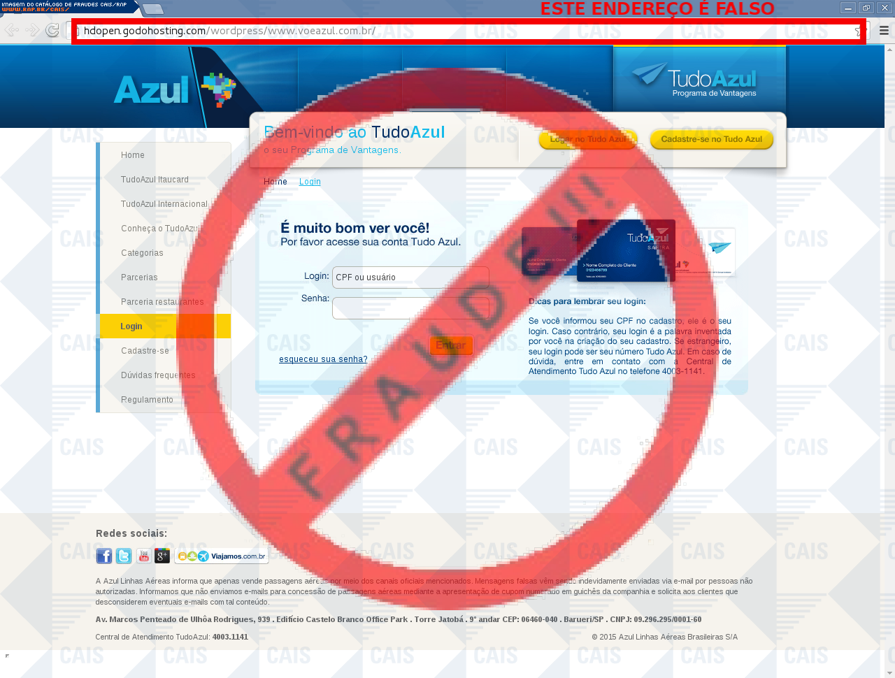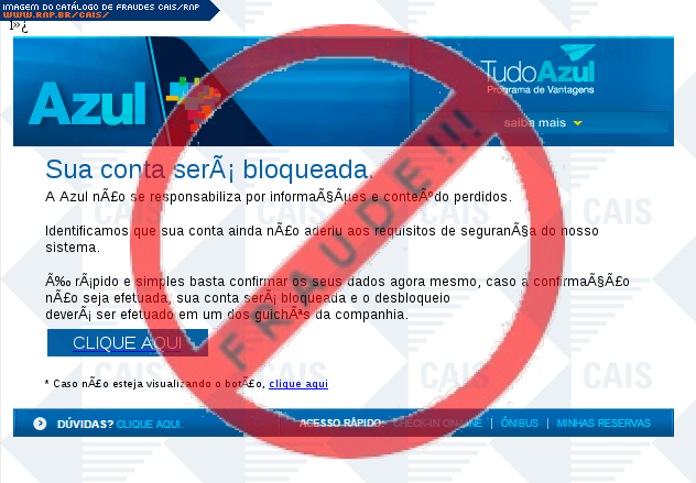 | comentário | O usuário recebe uma mensagem informando que sua conta na empresa aérea Azul será bloqueada sendo necessário fornecer algumas informações no link indicado, no entanto a página é falsa destinada a roubar os dados da vítima. | |