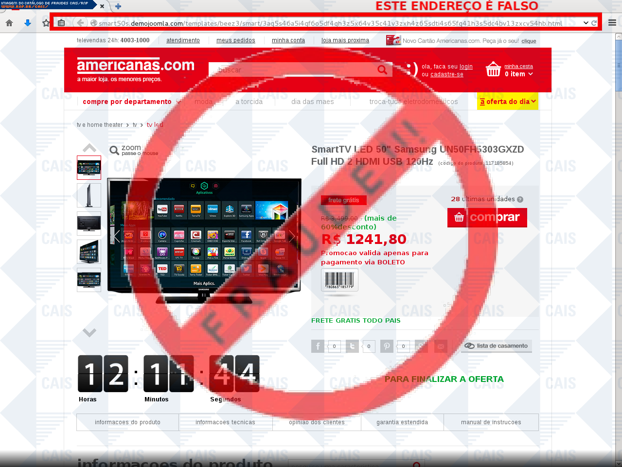 | comentário | A vítima recebe um email com uma suposta promoção de TVs por um preço atrativo. Porém, o site para o qual o link na mensagem redireciona é falso e tem como objetivo roubar informações bancárias da vítima. | |