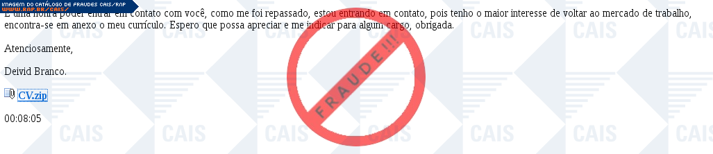| comentário | O usuário recebe uma mensagem contendo um currículo disponível em anexo, no entanto o arquivo originado é malicioso criado para roubar informações da vítima e instalar outros arquivos fraudulentos com o nome de PossibleThreat.P0. | |