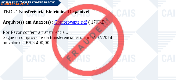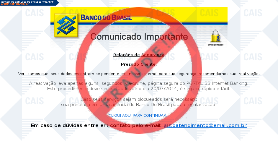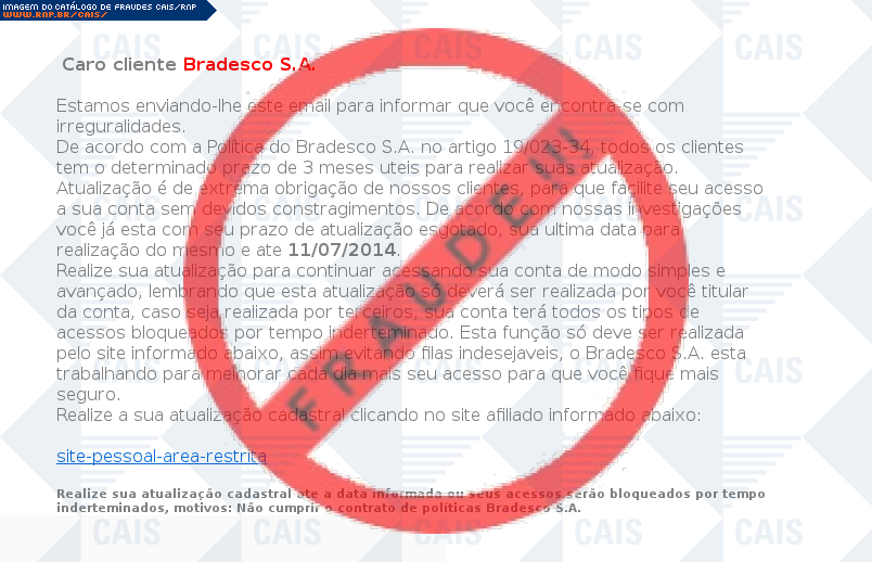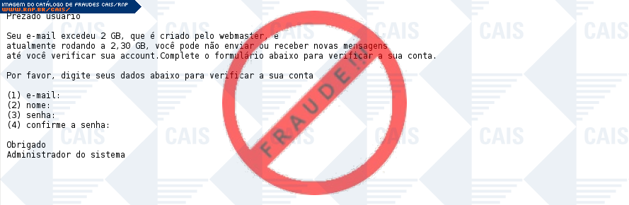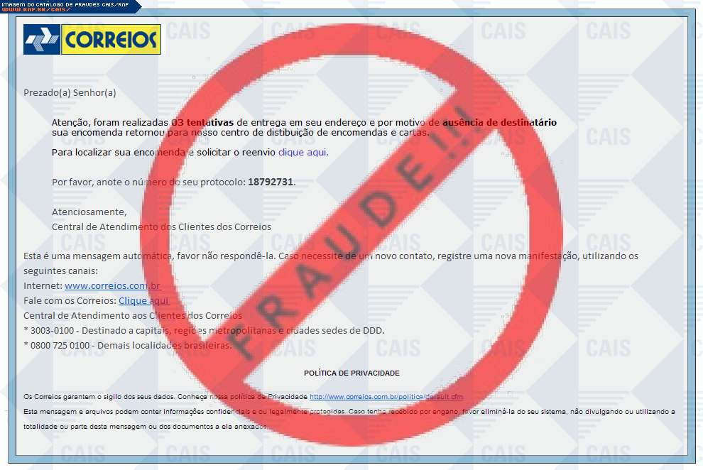 Esta página tem função informativa e educativa. Exibe uma coleção de imagens de phishing scam (fraudes eletrônicas) ou malware (código malicioso) veiculados por meio de spam (e-mail não-solicitado). Trata-se de conteúdo exemplificativo, não exaustivo, uma vez que não é possível contemplar todos os casos de fraudes existentes. Assim, caso você tenha conhecimento de um exemplar que não esteja aqui presente, isto não significa que não seja válido ou real. Inclusive incentivamos que você o envie para análise do CAIS para que, se for o caso, passe a integrar o nosso acervo.