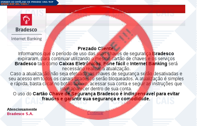 | comentário | A vítima recebe um e-mail informando que sua chave de segurança expiraram impossibilitando o uso de alguns serviços, sendo necessário para normalização uma atualização das informações pessoais. Porém o link disponibilizado redireciona para uma página falsa... (leia mais) | |