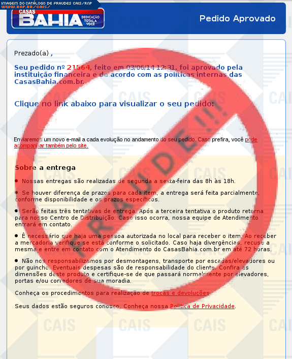 Com a disponibilização pública deste serviço, não é intenção do Centro de Atendimento a Incidentes de Segurança (CAIS) da Rede Nacional de Ensino e Pesquisa (RNP) violar direitos autorais sobre marcas registradas ou logotipos de empresas que porventura constem das amostras. O objetivo é tão somente alertar os usuários sobre as espécies de golpes que se utilizam de tais propriedades intelectuais ou industriais de forma criminosa.