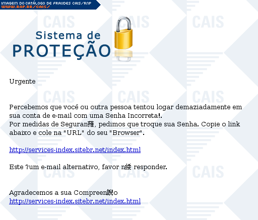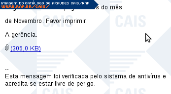 Esta página tem função informativa e educativa. Exibe uma coleção de imagens de phishing scam (fraudes eletrônicas) ou malware (código malicioso) veiculados por meio de spam (e-mail não-solicitado). Trata-se de conteúdo exemplificativo, não exaustivo, uma vez que não é possível contemplar todos os casos de fraudes existentes. Assim, caso você tenha conhecimento de um exemplar que não esteja aqui presente, isto não significa que não seja válido ou real. Inclusive incentivamos que você o envie para análise do CAIS para que, se for o caso, passe a integrar o nosso acervo.