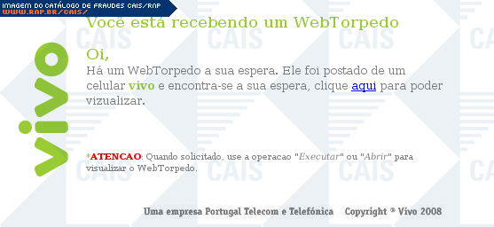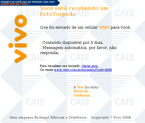 | comentário | Mais um exemplar de mensagem que se passa por um comunicado da operadora de telefonia Vivo. A mensagem traz o link para um suposto FotoTorpedo. O software malicioso é Trojan-Downloader.Win32.Banload.xcq (F-Secure). | |