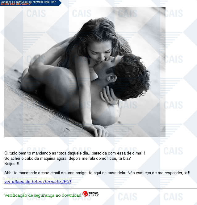 | comentário | Mensagem típica de uma pessoa que não se identifica com link para um álbum de fotos. Observações: (1) o link para o software malicioso da amostra não estava mais disponível no momento da análise. | |