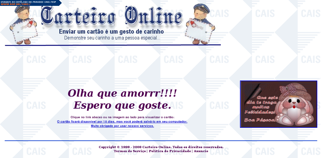 | comentário | Mensagem com cartão virtual do serviço Carteiro Online. O fato curioso deste cartão é a presença de uma foto de páscoa. O software malicioso é AdWare.Win32.Agent.gyg (F-Secure). | |
