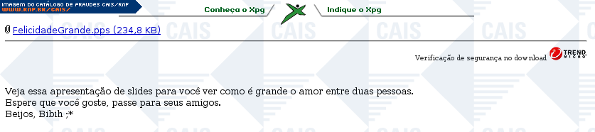 | arquivo malicioso | FelicidadeGrande.pps.com | |