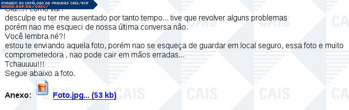 | comentário | Mensagem típica de um desconhecido com fotos comprometedoras. O software malicioso é Suspicious:W32/Malware!Gemini (F-Secure). | |
