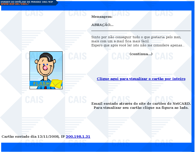 | comentário | Mensagem que tenta se passar por um cartão virtual de uma mulher, enviado pelo serviço NetCard (http://netcard.com.br/). Ao clicar no link surge um pop-up informando sobre a necessidade de instalação do software Adobe Reader. Logo depois o usuário é levado... (leia mais) | |