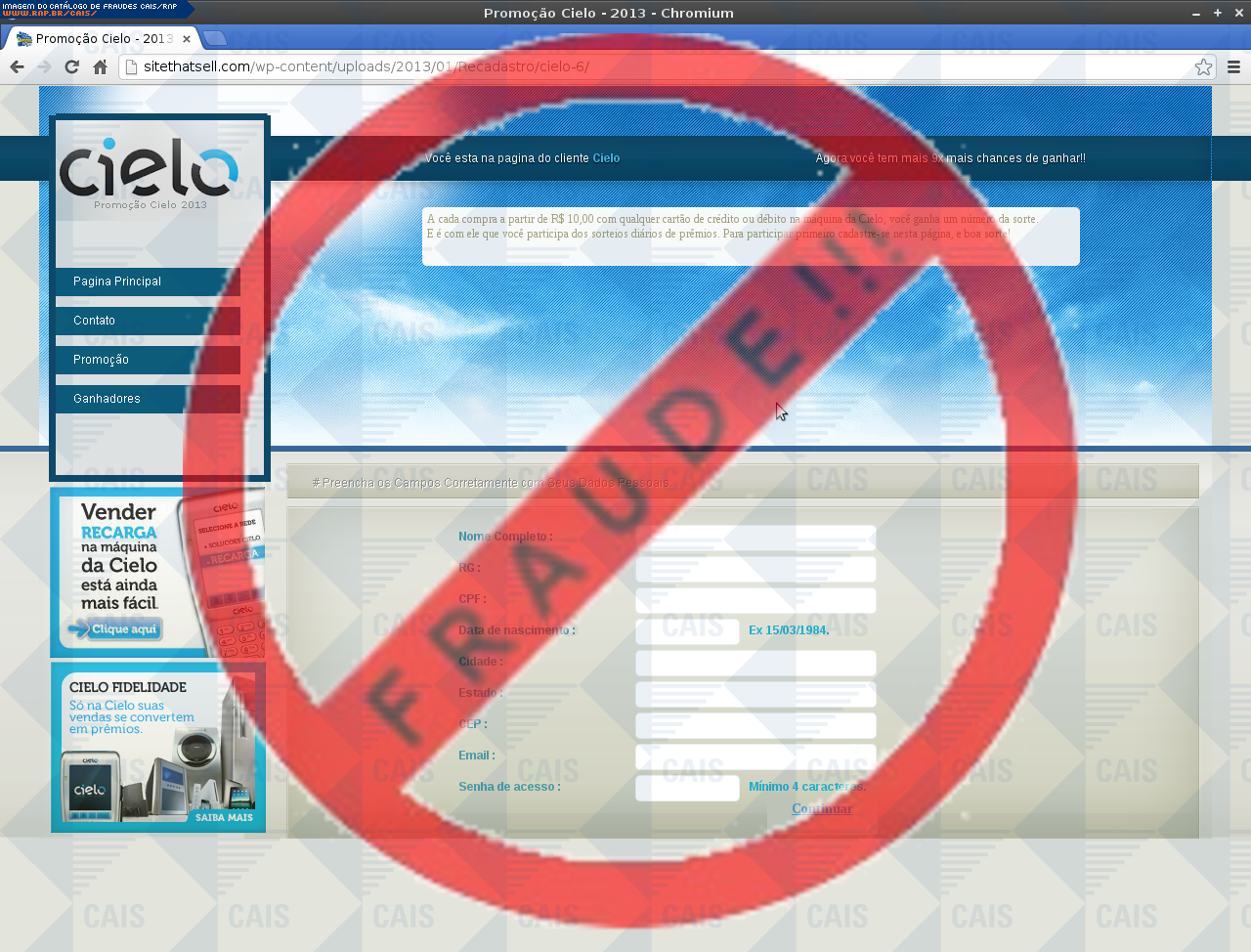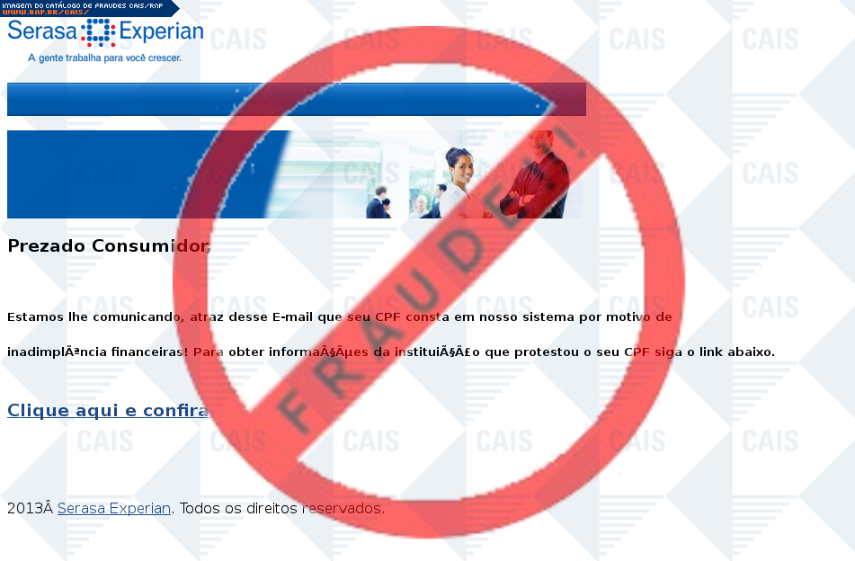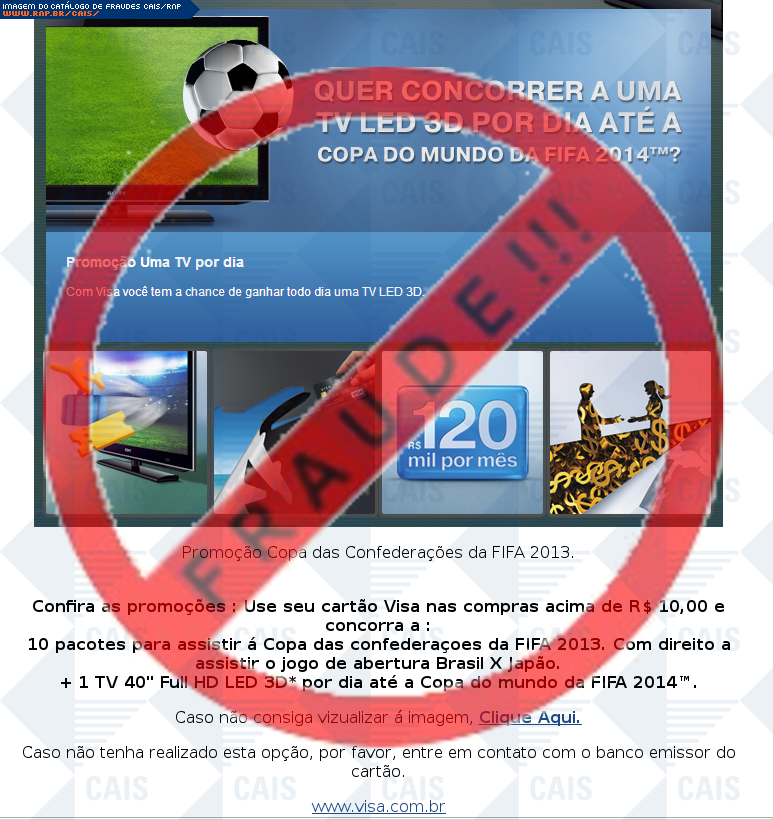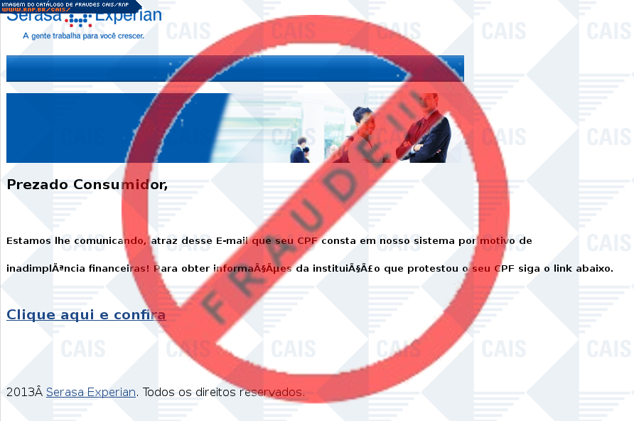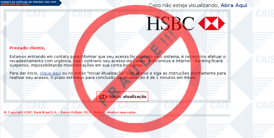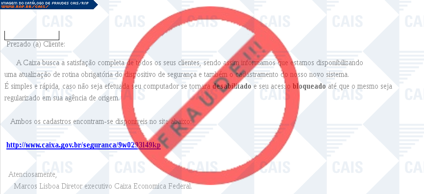 Esta página tem função informativa e educativa. Exibe uma coleção de imagens de phishing scam (fraudes eletrônicas) ou malware (código malicioso) veiculados por meio de spam (e-mail não-solicitado). Trata-se de conteúdo exemplificativo, não exaustivo, uma vez que não é possível contemplar todos os casos de fraudes existentes. Assim, caso você tenha conhecimento de um exemplar que não esteja aqui presente, isto não significa que não seja válido ou real. Inclusive incentivamos que você o envie para análise do CAIS para que, se for o caso, passe a integrar o nosso acervo.