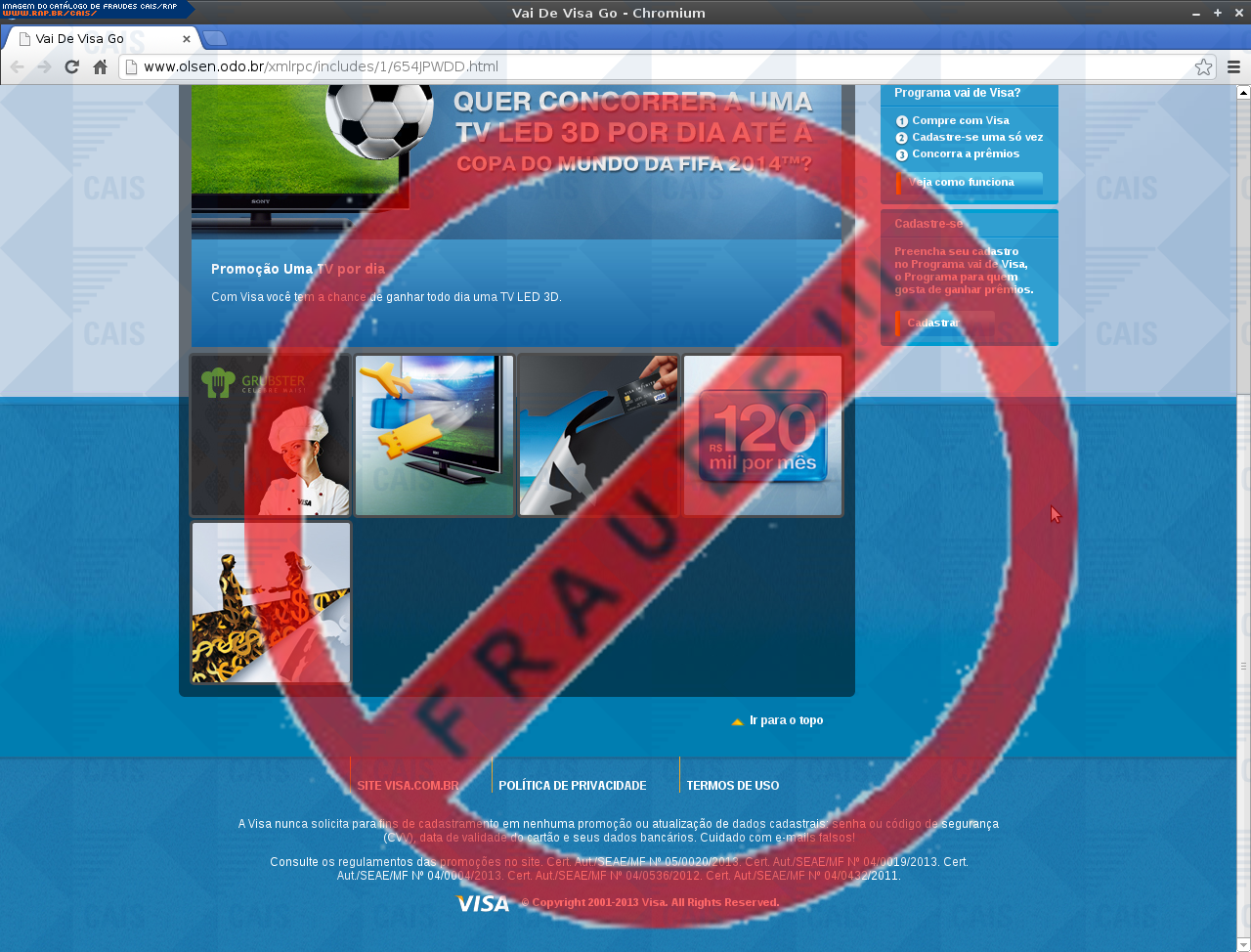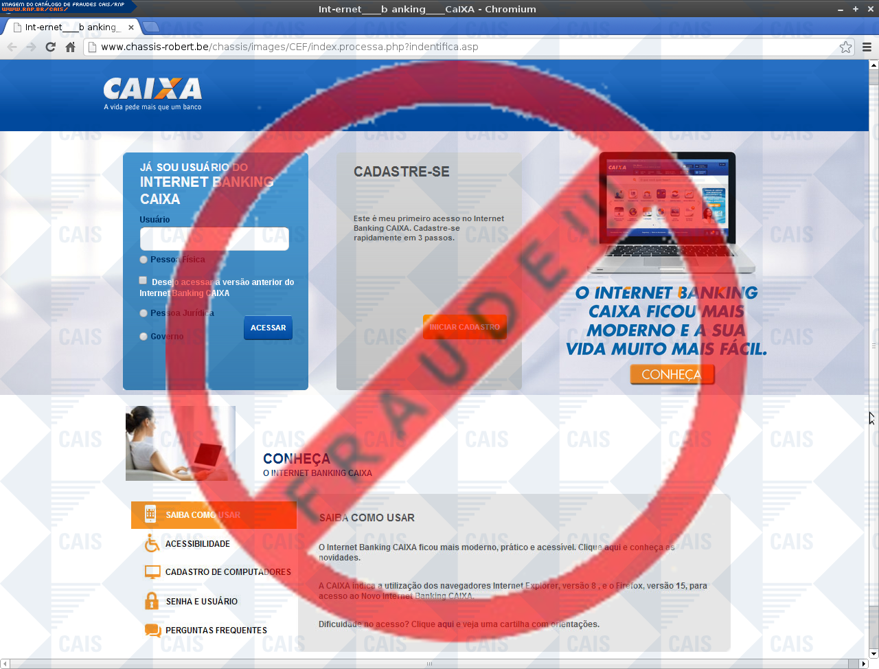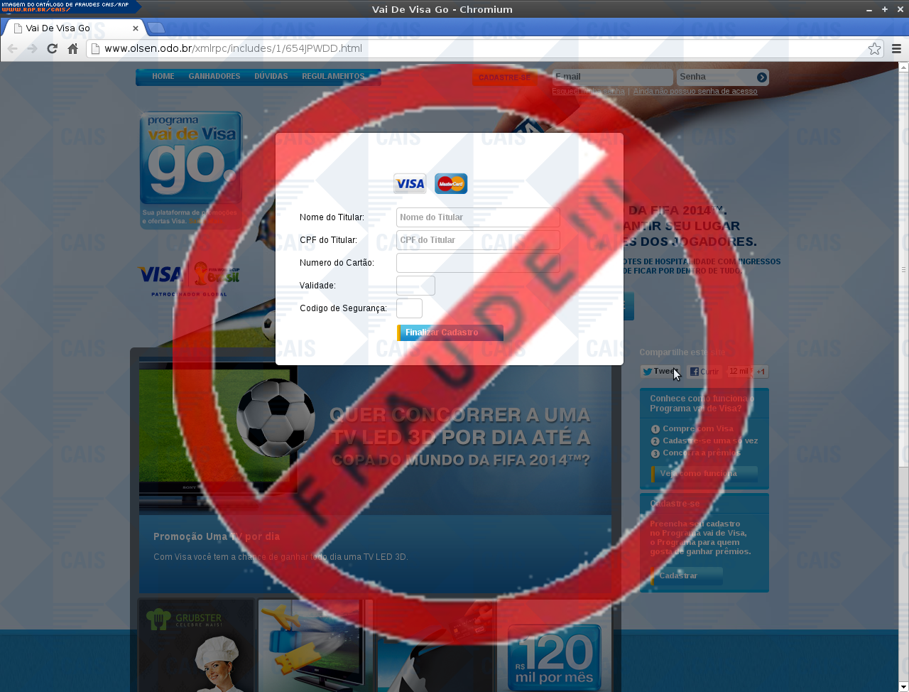Esta página tem função informativa e educativa. Exibe uma coleção de imagens de phishing scam (fraudes eletrônicas) ou malware (código malicioso) veiculados por meio de spam (e-mail não-solicitado). Trata-se de conteúdo exemplificativo, não exaustivo, uma vez que não é possível contemplar todos os casos de fraudes existentes. Assim, caso você tenha conhecimento de um exemplar que não esteja aqui presente, isto não significa que não seja válido ou real. Inclusive incentivamos que você o envie para análise do CAIS para que, se for o caso, passe a integrar o nosso acervo.