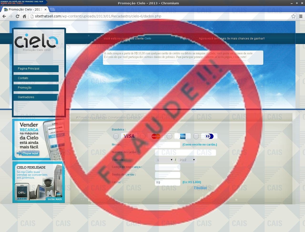 ![]() Fraudes identificadas e divulgadas pelo CAISA partir de 2008, todas as fraudes identificadas pelo CAIS estão sendo ordenadas de acordo com a data de distribuição e disponibilizadas para consulta, com o intuito de conscientizar a comunidade sobre os principais golpes que estão em circulação. Adicionalmente, o CAIS envia alertas de segurança através da lista CAIS Alerta quando uma fraude mostra-se particularmente perigosa aos usuários de computadores. Reporte fraudes:
