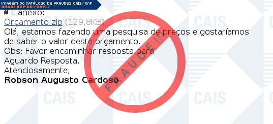 | comentário | Malware: Nessa fraude o usuario recebe um email solicitando-o um orçamento, mas o link disponibilizado para os documentos base para o orçamento é iniciado o download de um malware. | |