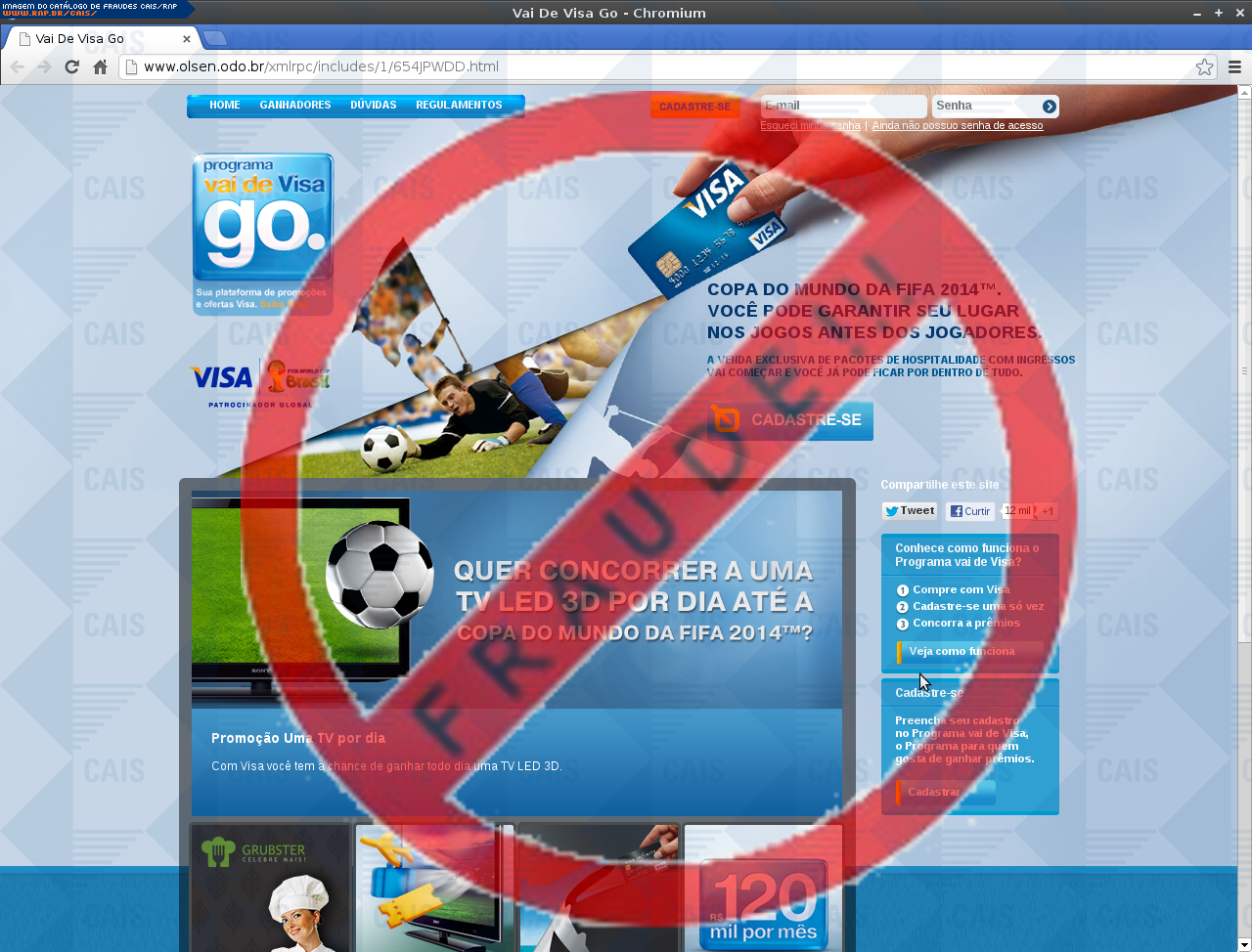 | comentário | Phishing: Nessa ocorrencia o usuario recebe uma proposta de participação numa determinada promoção, mas trata-se de uma proposta falsa. Ao acessar o link para cadastramento o usuario é direcionado a uma pagina falsa, clone de uma pagina original da empresa,... (leia mais) | |