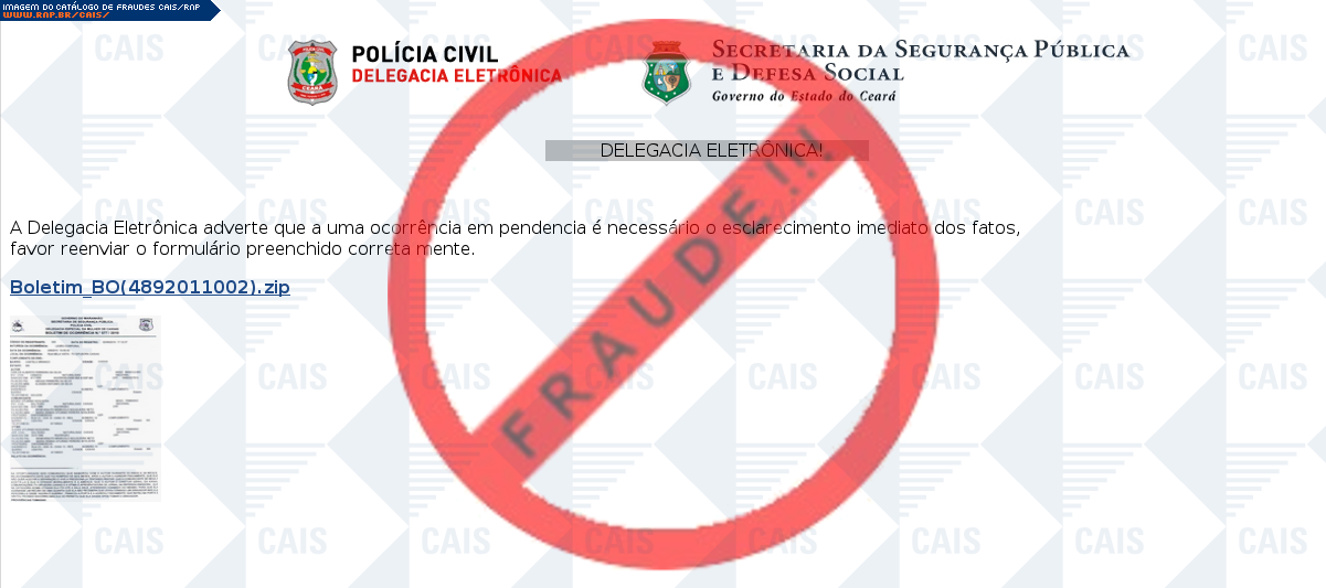 | comentário | Malware:Nessa fraude um email é enviado ao usuario contendo um suposto boletim de ocorrencias, mas ao tentar acessá-lo é feito o download de um malware de caracteriisticas desconhecidas. | |