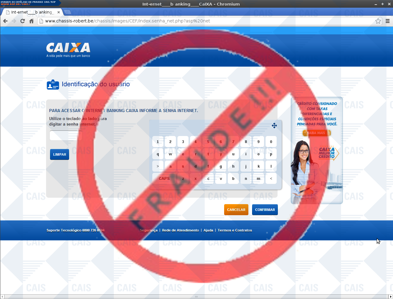 | comentário | Phishing: Mais uma tentativa de phishing utilizando paginas falsas de banco. Nessa ocorrencia o fraudador disponibiliza um link para uma pagina semelhnate a pagina original do banco, porém falsa e solicita dados sensiveis do usuario tais como login e senha... (leia mais) | |