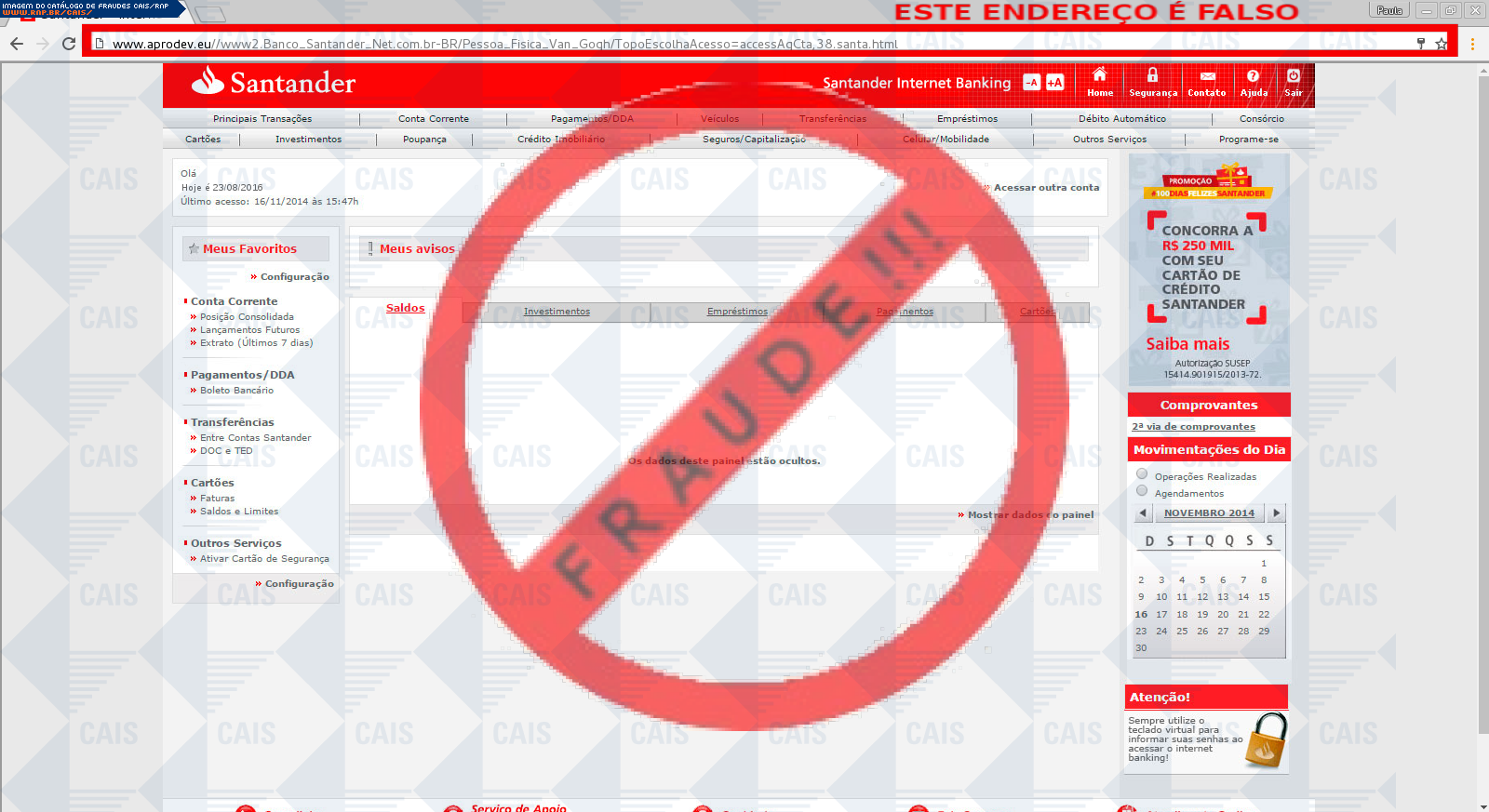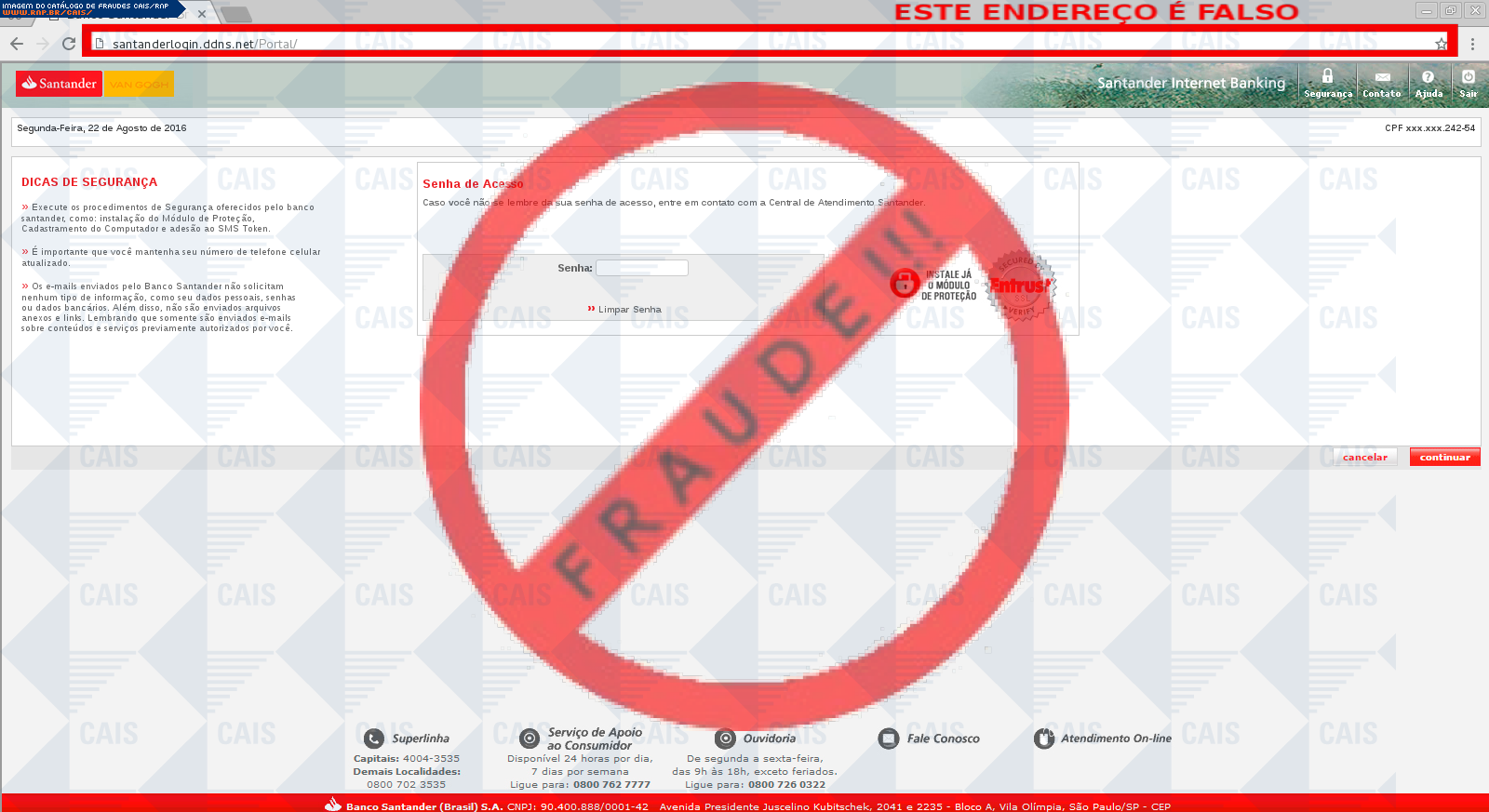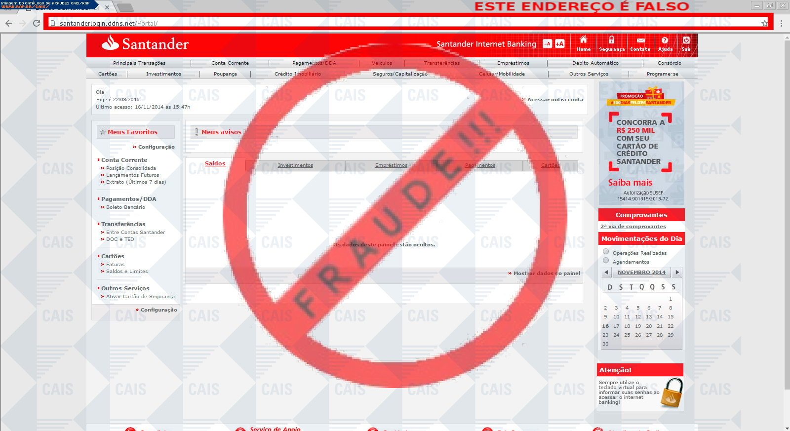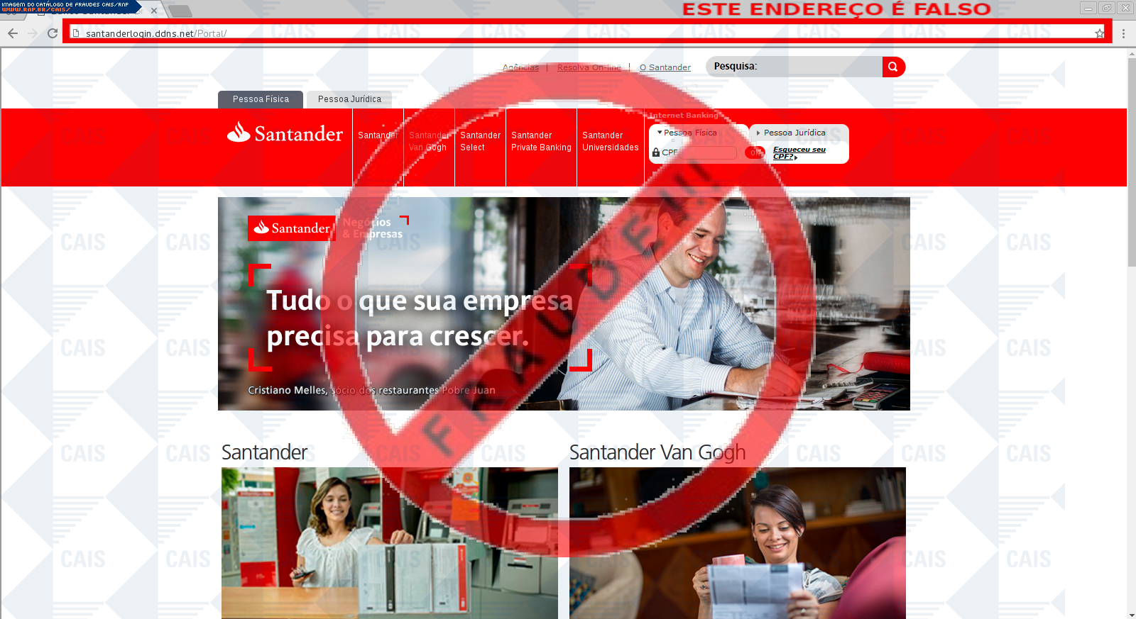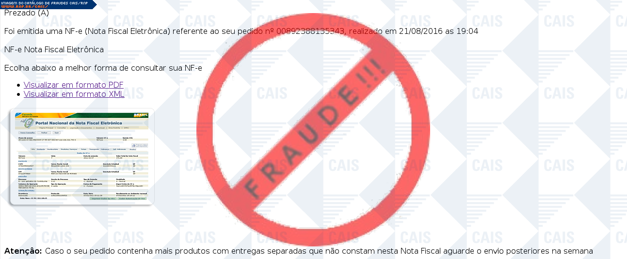 Esta página tem função informativa e educativa. Exibe uma coleção de imagens de phishing scam (fraudes eletrônicas) ou malware (código malicioso) veiculados por meio de spam (e-mail não-solicitado). Trata-se de conteúdo exemplificativo, não exaustivo, uma vez que não é possível contemplar todos os casos de fraudes existentes. Assim, caso você tenha conhecimento de um exemplar que não esteja aqui presente, isto não significa que não seja válido ou real. Inclusive incentivamos que você o envie para análise do CAIS para que, se for o caso, passe a integrar o nosso acervo.