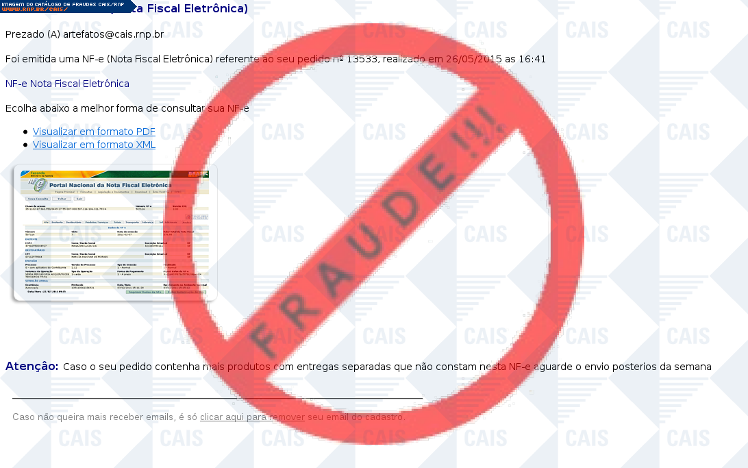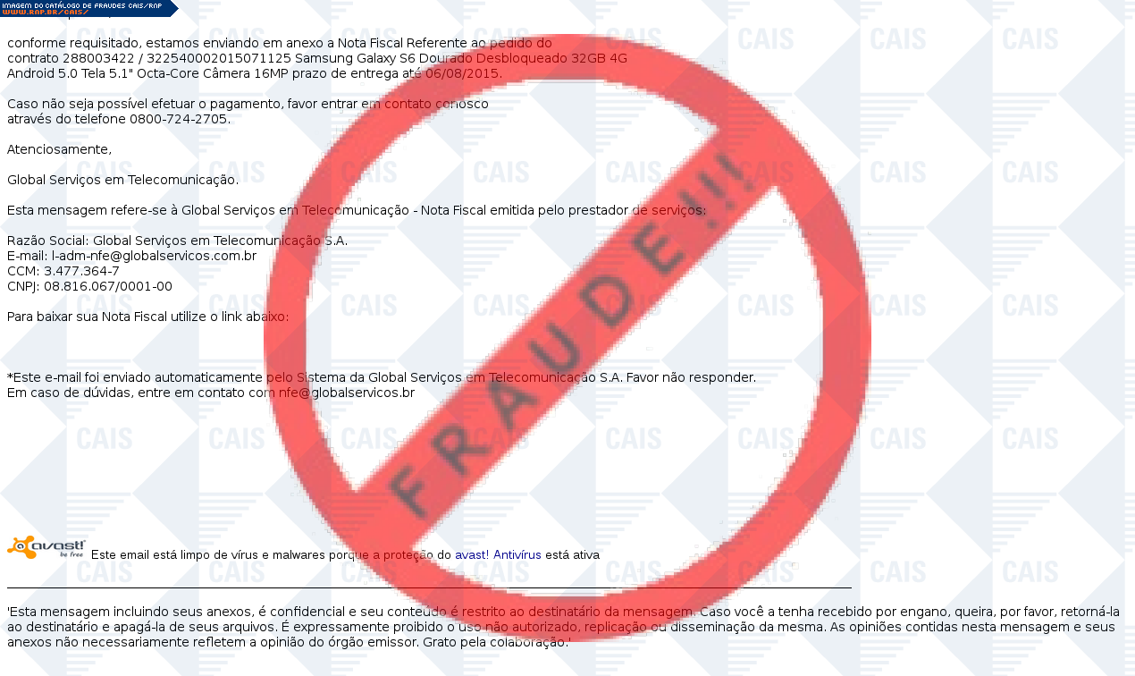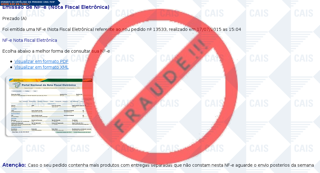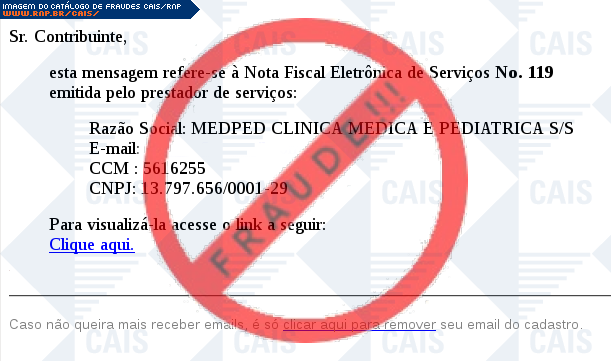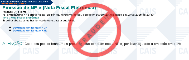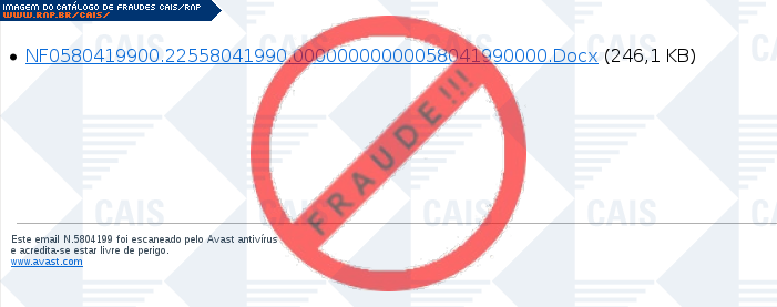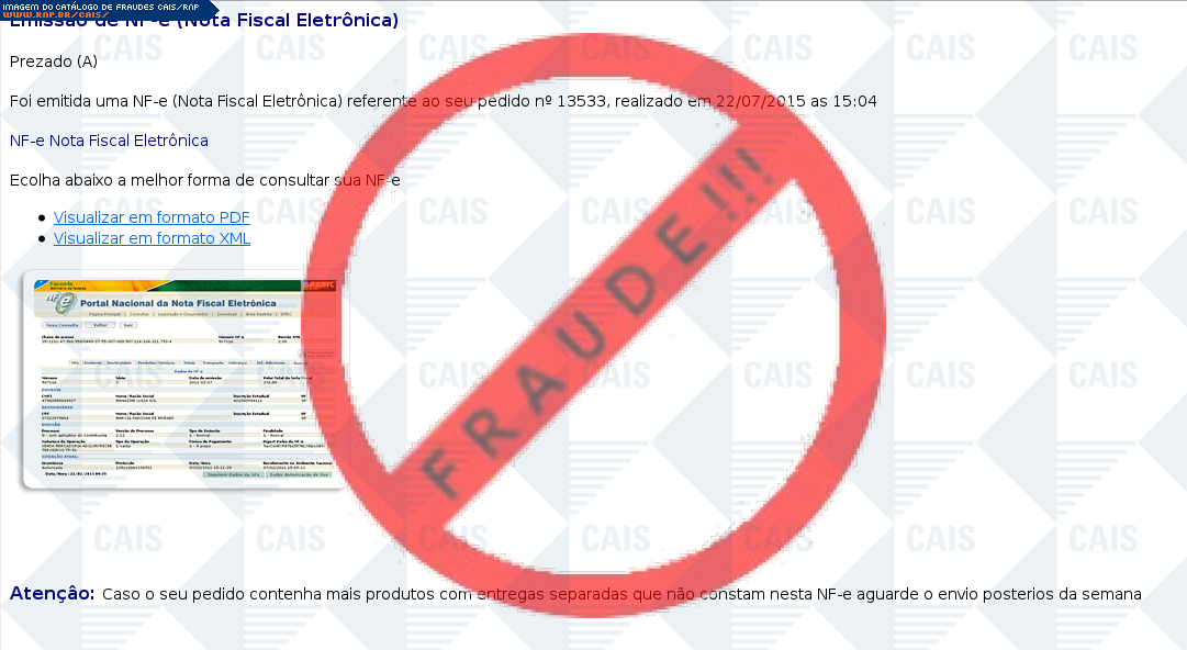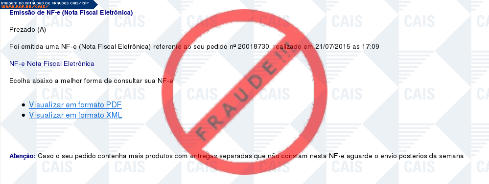 Esta página tem função informativa e educativa. Exibe uma coleção de imagens de phishing scam (fraudes eletrônicas) ou malware (código malicioso) veiculados por meio de spam (e-mail não-solicitado). Trata-se de conteúdo exemplificativo, não exaustivo, uma vez que não é possível contemplar todos os casos de fraudes existentes. Assim, caso você tenha conhecimento de um exemplar que não esteja aqui presente, isto não significa que não seja válido ou real. Inclusive incentivamos que você o envie para análise do CAIS para que, se for o caso, passe a integrar o nosso acervo.