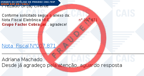 | comentário | A vítima recebe um email informando que existe uma suposta nota fiscal eletrônica em anexo, porém o link na mensagem leva ao download de um malware que tem como objetivo infectar o computador da vítima. | |