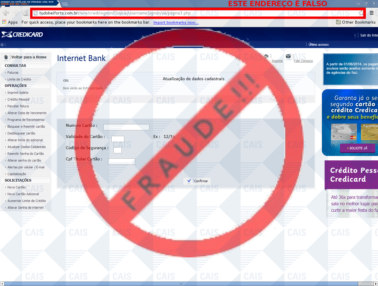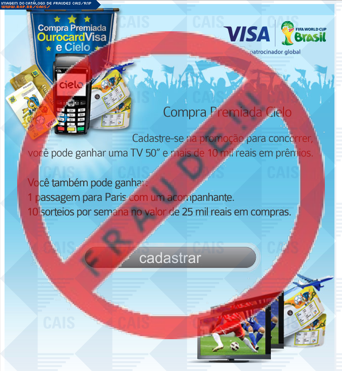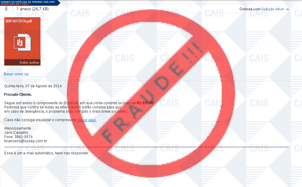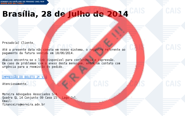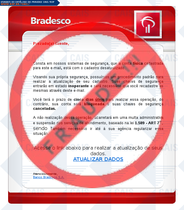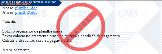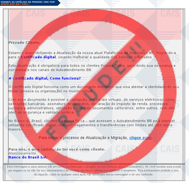 Esta página tem função informativa e educativa. Exibe uma coleção de imagens de phishing scam (fraudes eletrônicas) ou malware (código malicioso) veiculados por meio de spam (e-mail não-solicitado). Trata-se de conteúdo exemplificativo, não exaustivo, uma vez que não é possível contemplar todos os casos de fraudes existentes. Assim, caso você tenha conhecimento de um exemplar que não esteja aqui presente, isto não significa que não seja válido ou real. Inclusive incentivamos que você o envie para análise do CAIS para que, se for o caso, passe a integrar o nosso acervo.