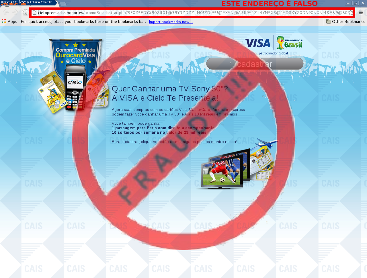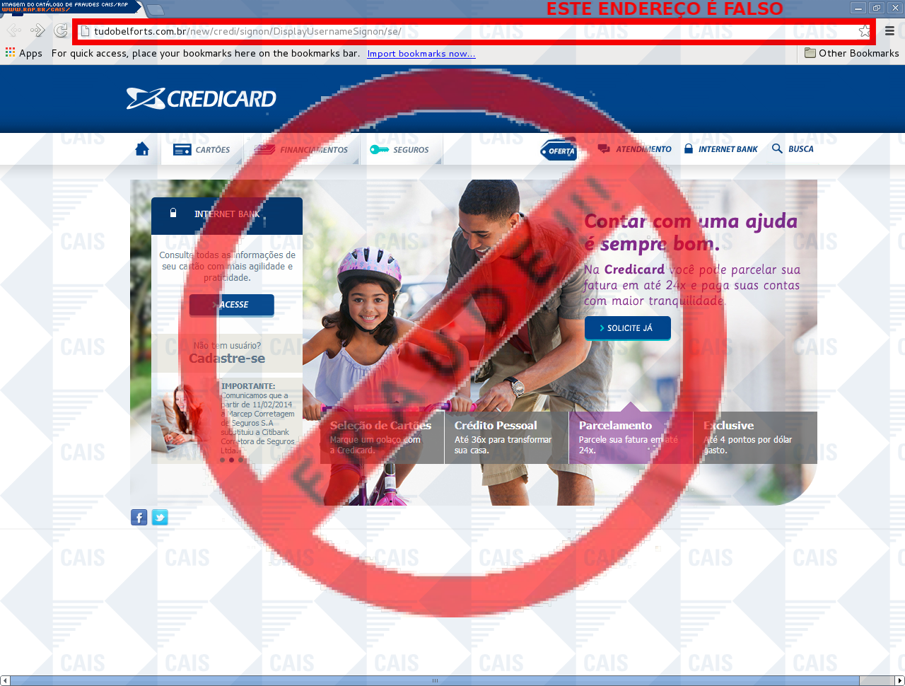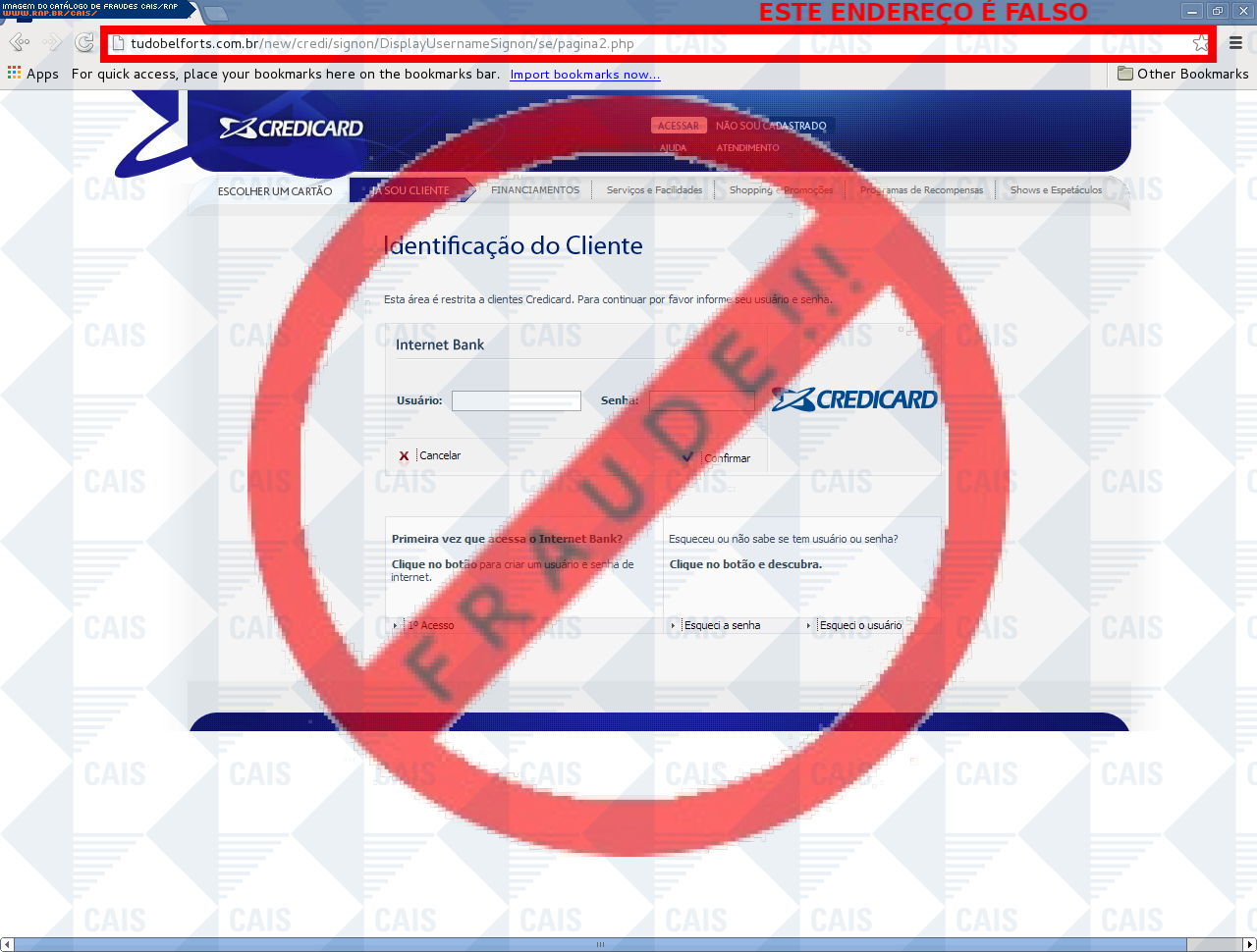 Esta página tem função informativa e educativa. Exibe uma coleção de imagens de phishing scam (fraudes eletrônicas) ou malware (código malicioso) veiculados por meio de spam (e-mail não-solicitado). Trata-se de conteúdo exemplificativo, não exaustivo, uma vez que não é possível contemplar todos os casos de fraudes existentes. Assim, caso você tenha conhecimento de um exemplar que não esteja aqui presente, isto não significa que não seja válido ou real. Inclusive incentivamos que você o envie para análise do CAIS para que, se for o caso, passe a integrar o nosso acervo.