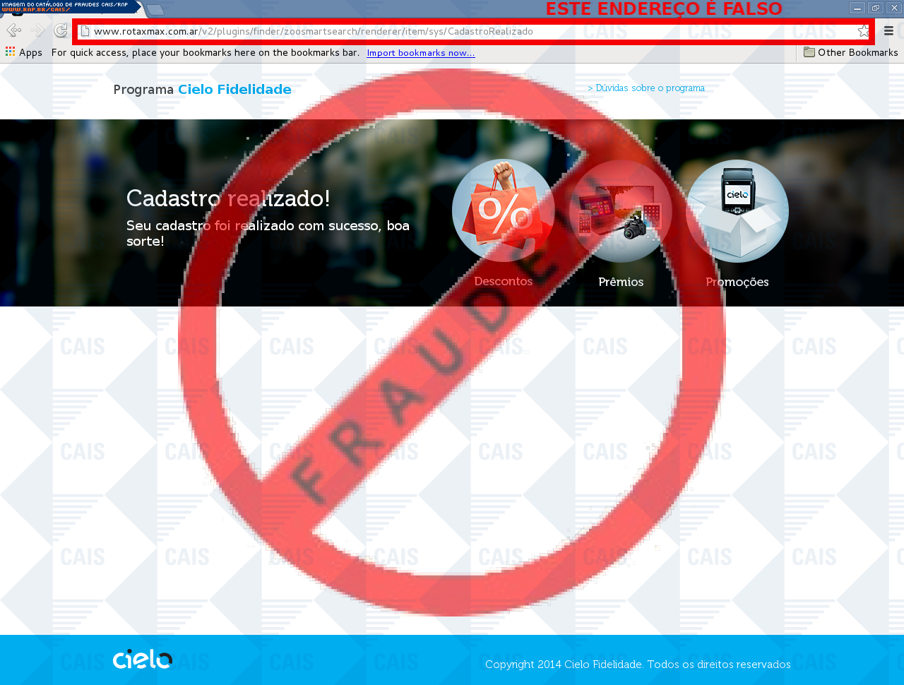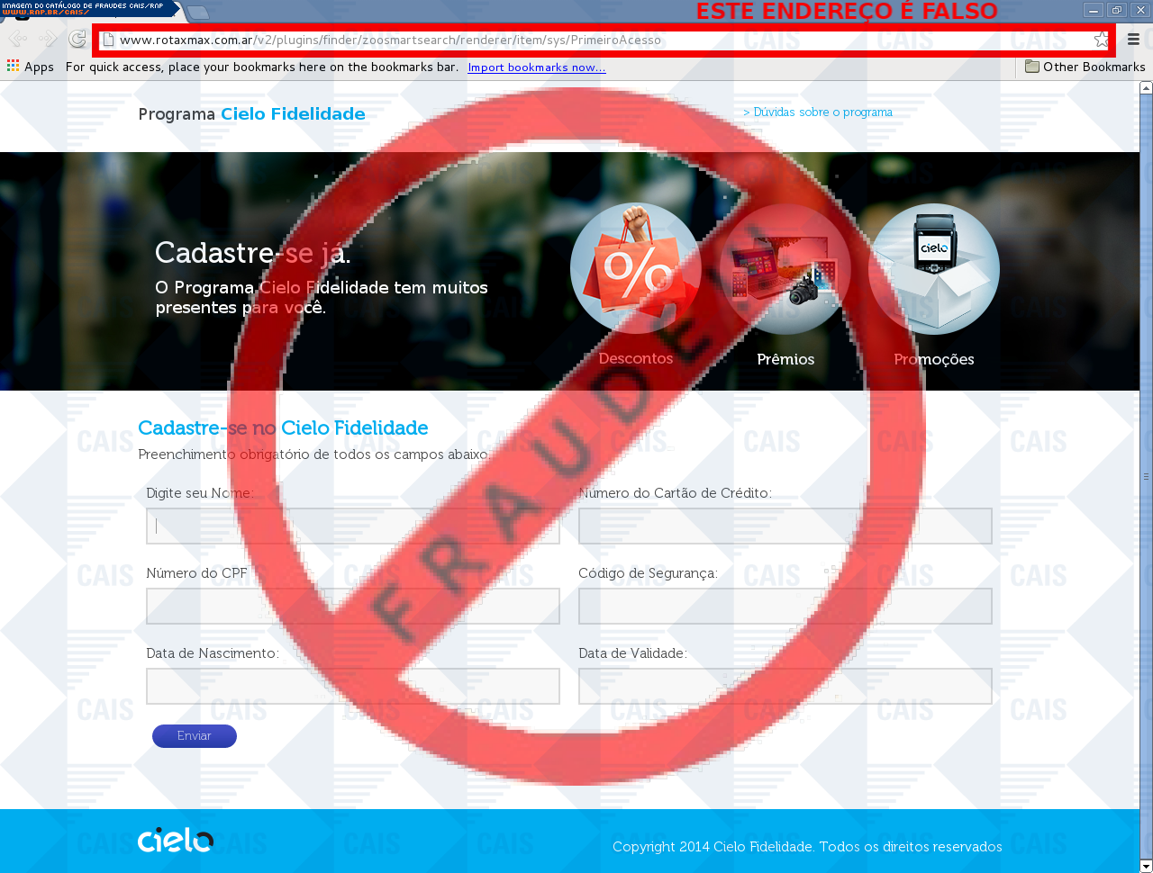 |   |  Fraudes identificadas e divulgadas pelo CAISA partir de 2008, todas as fraudes identificadas pelo CAIS estão sendo ordenadas de acordo com a data de distribuição e disponibilizadas para consulta, com o intuito de conscientizar a comunidade sobre os principais golpes que estão em circulação. Adicionalmente, o CAIS envia alertas de segurança através da lista CAIS Alerta quando uma fraude mostra-se particularmente perigosa aos usuários de computadores. Reporte fraudes: