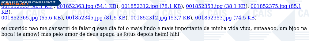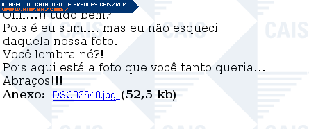 | comentário | Mensagem que se diz conter links para algumas fotos, mas na verdade o link aponta para um arquivo malicioso identificado como TR/Crypt.XPACK.Gen (AntiVir). | |