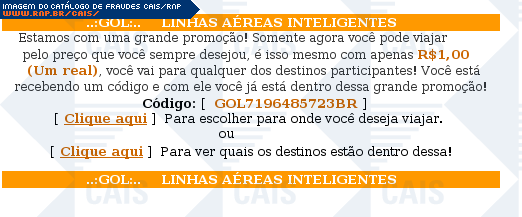 | comentário | Mensagem se passando por promoçao da empresa GOL com passagens a um real para diversas localidades. O link para consultar detalhes da promoção leva a um software malicioso identificado como Trojan-Banker.Win32.Banbra.gpy (F-Secure). | |