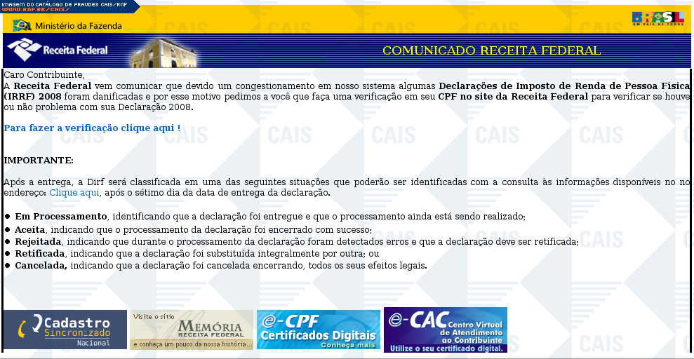 | comentário | Mensagem se passando pela Receita diz que houve congestionamento no sistema e que algumas declarações de imposto de renda foram danificadas. O email contém um link malicioso onde o recebedor da mensagem deveria verificar se sua declaração foi comprometida.... (leia mais) | |