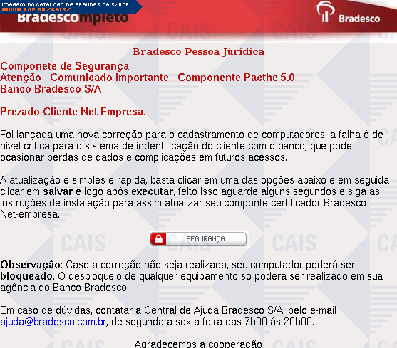 | comentário | Mensagem se passando pelo banco Bradesco pedindo para instalar uma suposta atualização de cadastro de computadores, na versão 5.0. O link para tal atualização leva a um software malicioso identificado como TR/Crypt.XPACK.Gen (AntiVir). | |
