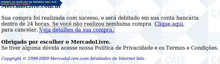 | comentário | Fraude que utiliza o nome do site MercadoLivre informando que uma suposta compra foi realizada com sucesso, e será debitada na conta bancária dentro de 24 horas. O arquivo malicioso não foi encontrado no momento da análise. | |