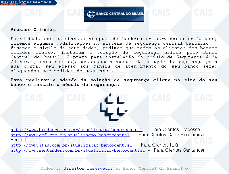 Esta página tem função informativa e educativa. Exibe uma coleção de imagens de phishing scam (fraudes eletrônicas) ou malware (código malicioso) veiculados por meio de spam (e-mail não-solicitado). Trata-se de conteúdo exemplificativo, não exaustivo, uma vez que não é possível contemplar todos os casos de fraudes existentes. Assim, caso você tenha conhecimento de um exemplar que não esteja aqui presente, isto não significa que não seja válido ou real. Inclusive incentivamos que você o envie para análise do CAIS para que, se for o caso, passe a integrar o nosso acervo.