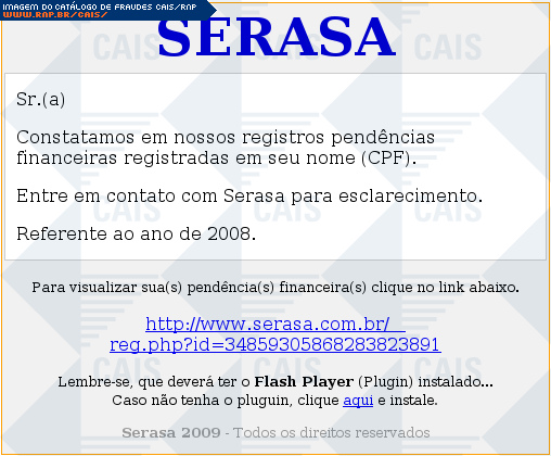 | comentário | Mensagem se passando por comunicado do Serasa a respeito de dívidas em nome da vítima. Um link que mostraria detalhes de tal dívida leva, na verdade, a um software malicioso identificado como Trojan-Downloader.Win32.Small.jgb (Kaspersky). | |