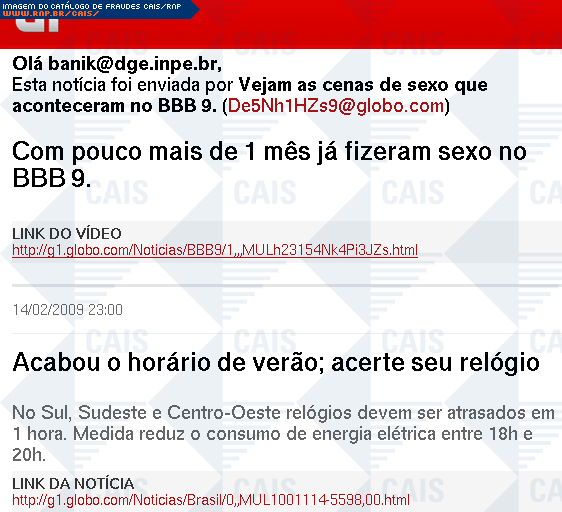 | comentário | Mensagem se passando por notícia do portal G1 da Globo contendo link para suposto video de sexo no Big Brother 9. O link leva a um software malicioso Heur.Downloader (Kaspersky). | |