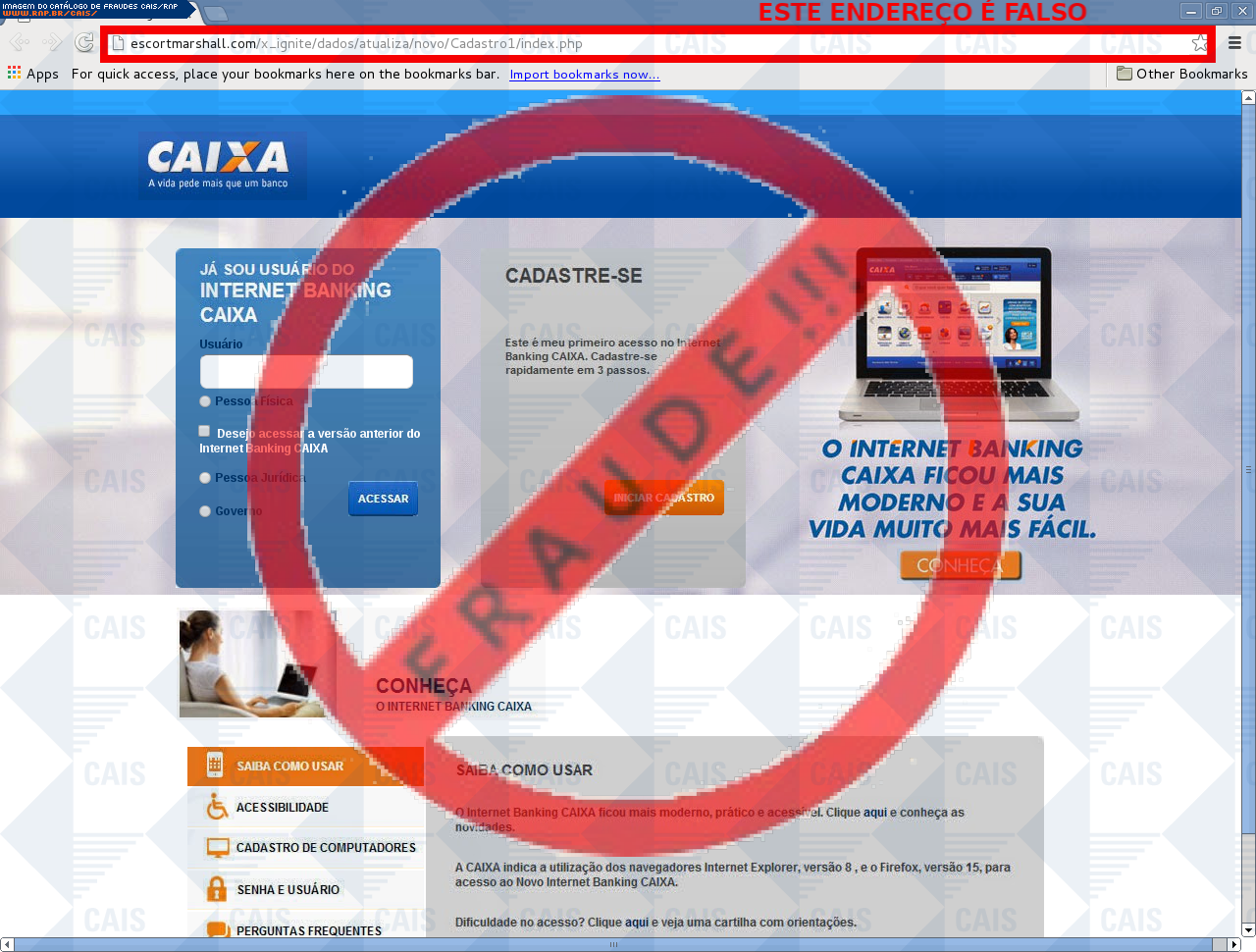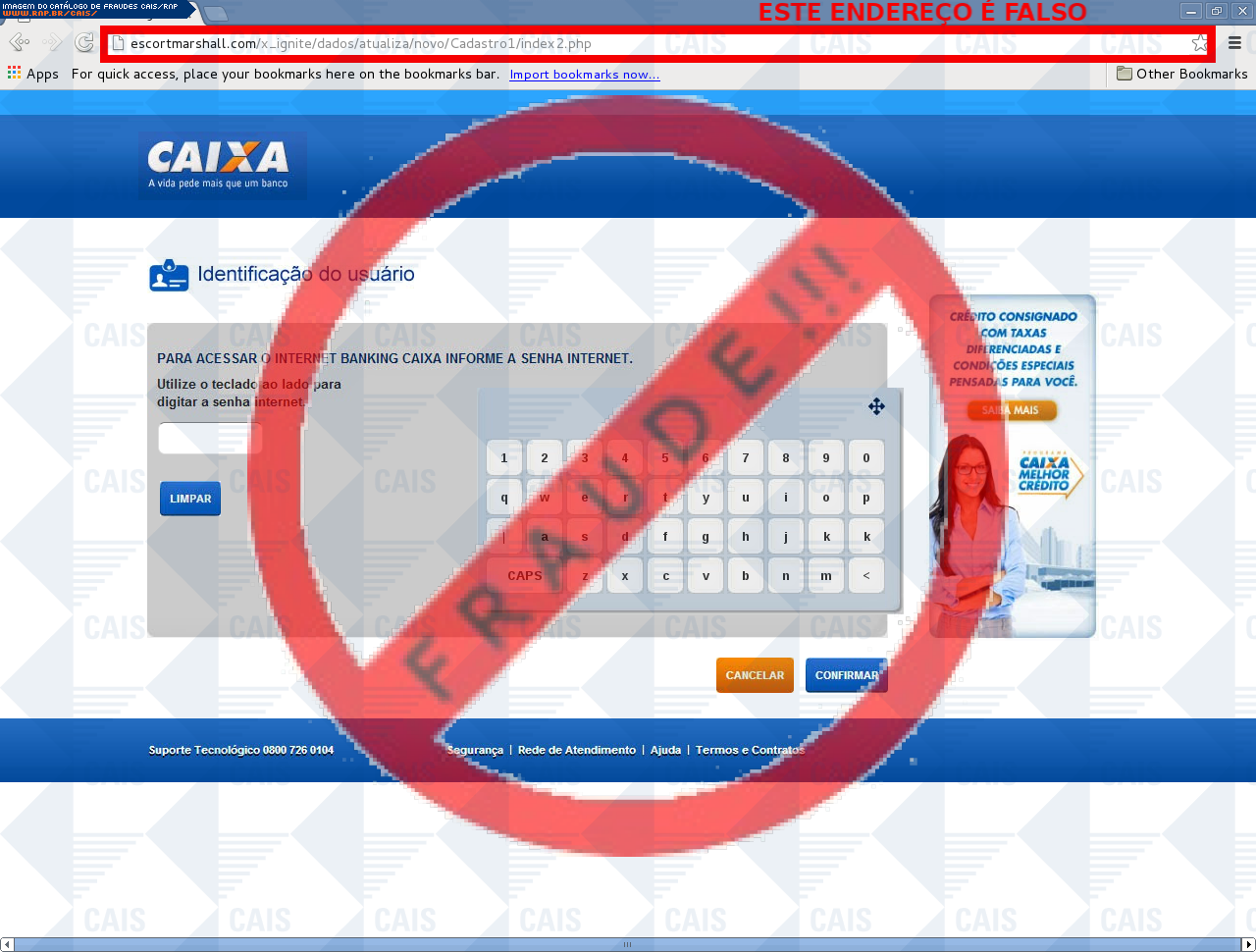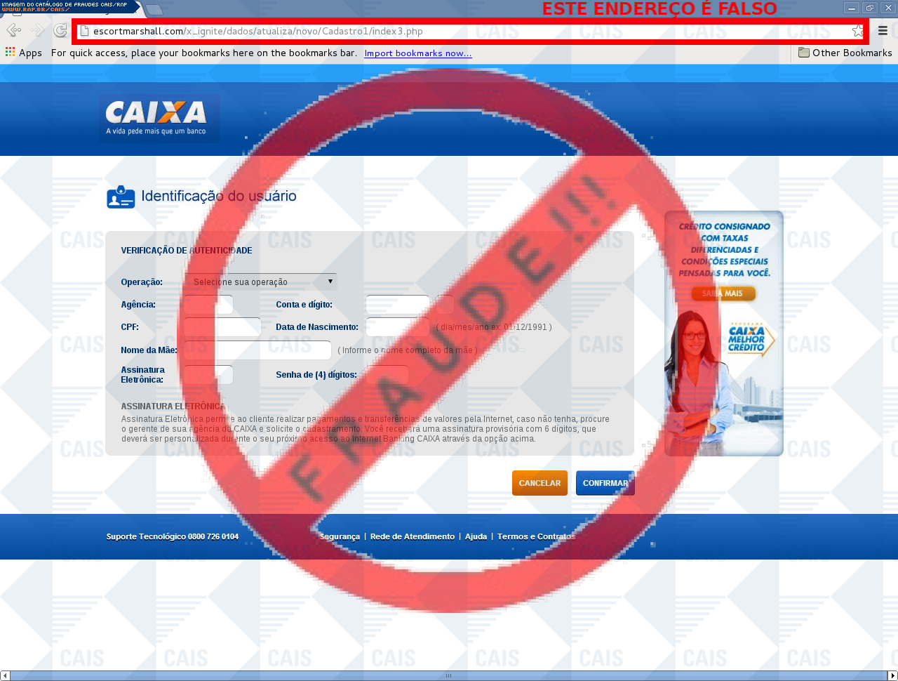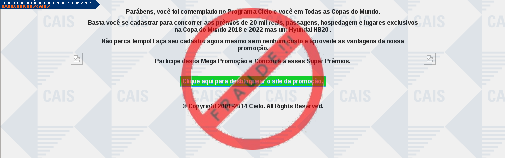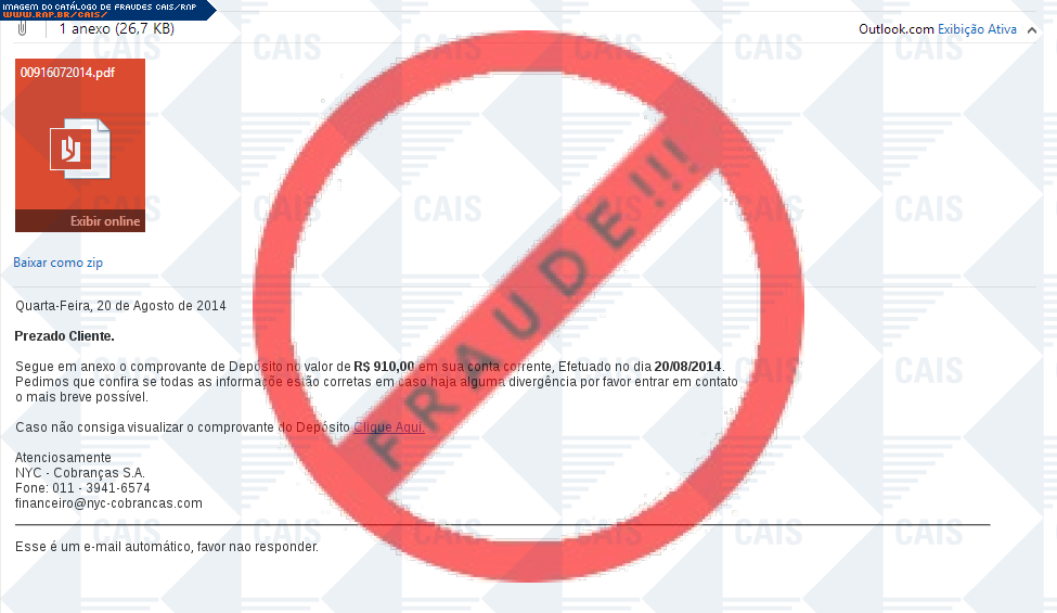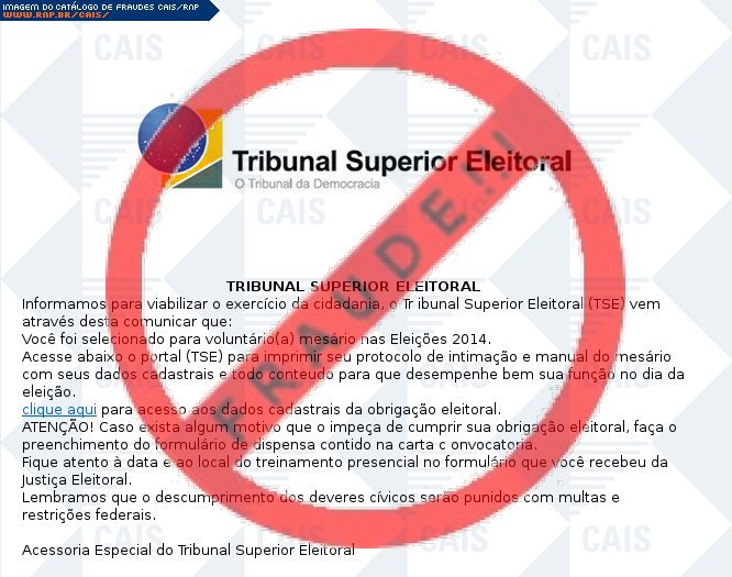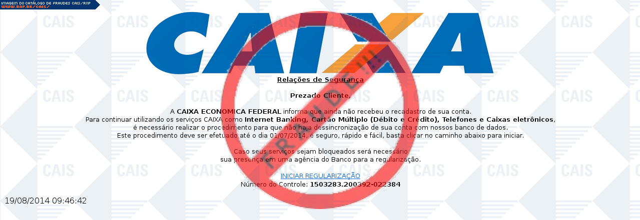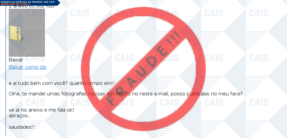 Esta página tem função informativa e educativa. Exibe uma coleção de imagens de phishing scam (fraudes eletrônicas) ou malware (código malicioso) veiculados por meio de spam (e-mail não-solicitado). Trata-se de conteúdo exemplificativo, não exaustivo, uma vez que não é possível contemplar todos os casos de fraudes existentes. Assim, caso você tenha conhecimento de um exemplar que não esteja aqui presente, isto não significa que não seja válido ou real. Inclusive incentivamos que você o envie para análise do CAIS para que, se for o caso, passe a integrar o nosso acervo.