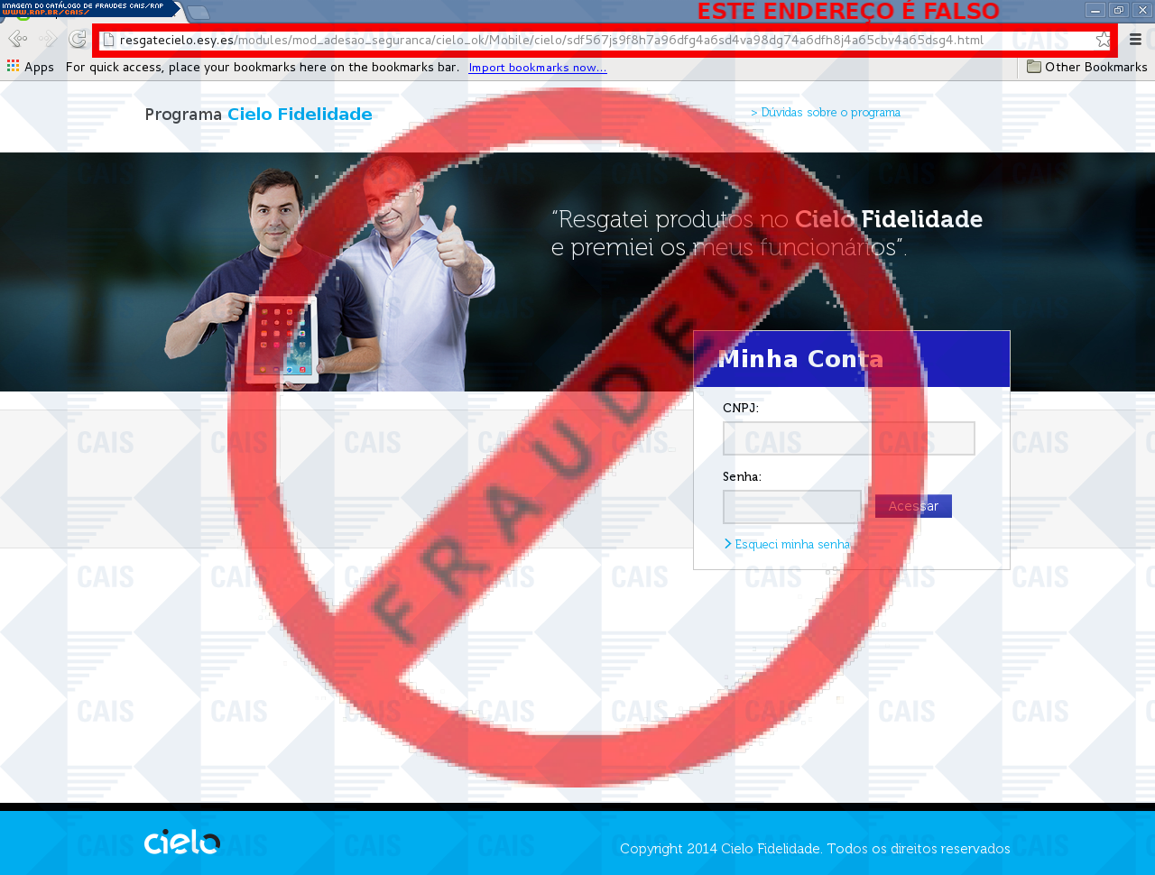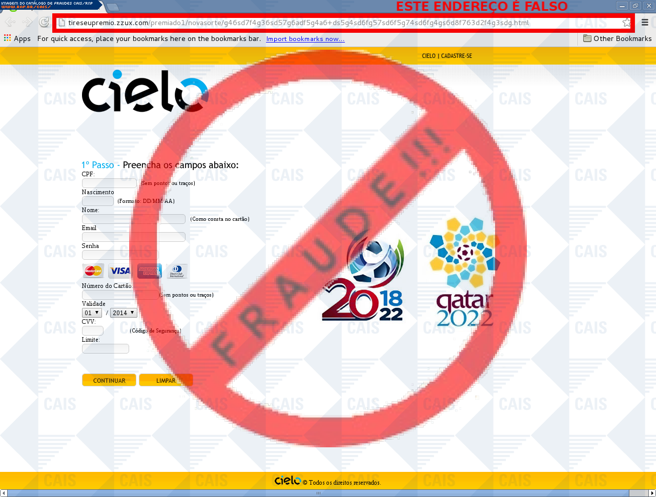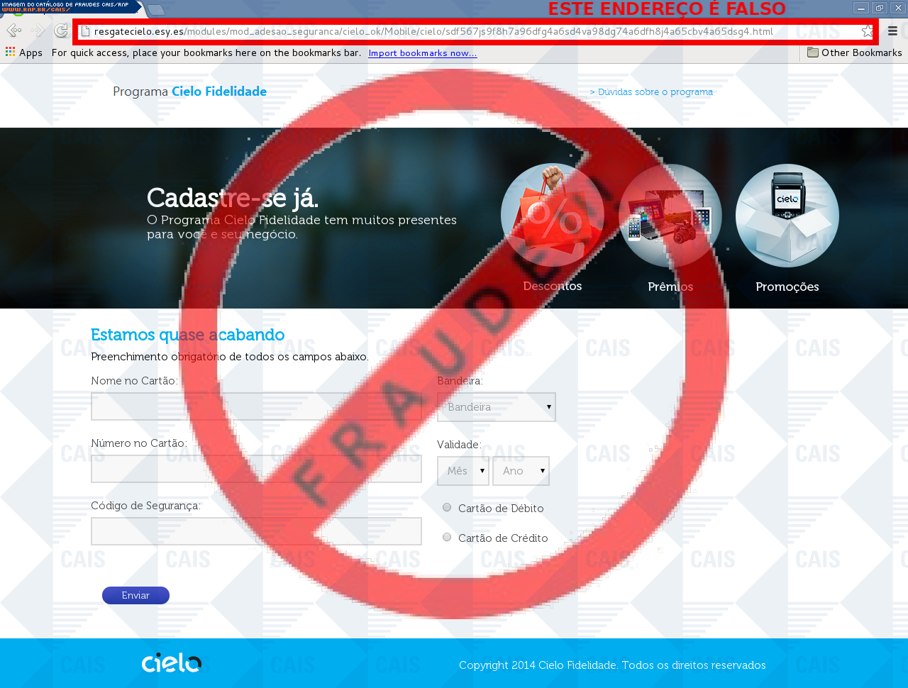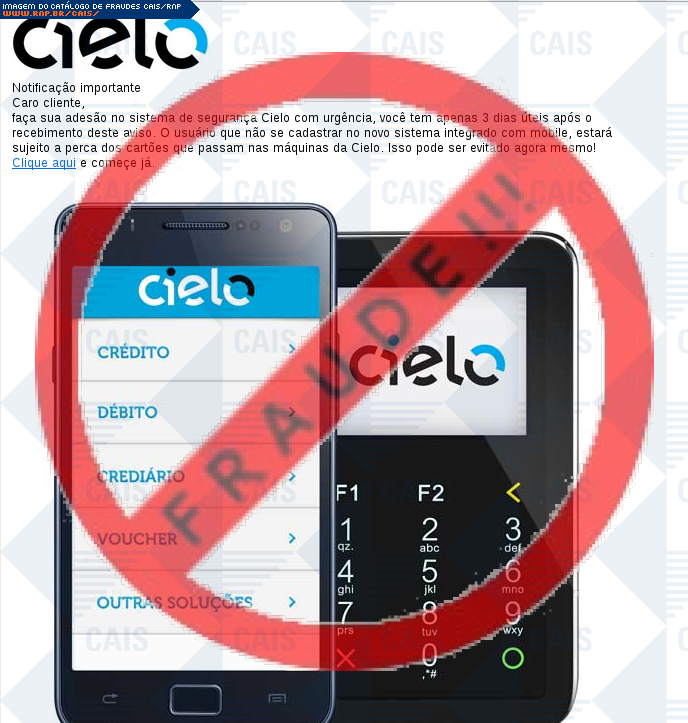 | comentário | A vítima recebe um e-mail informando que é necessário realizar a adesão ao novo sistema de segurança Cielo através de um cadastro no link indicado, no entanto a página é falsa criada para roubar as informações do cartão da vítima. | |