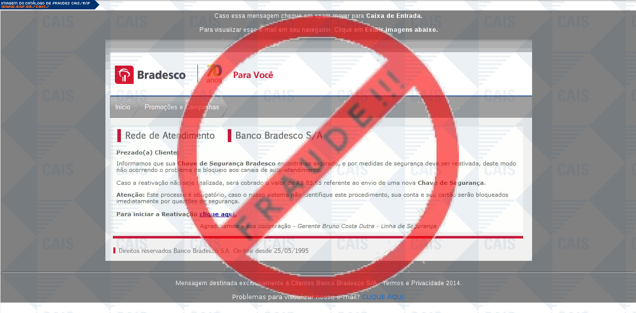 | comentário | O usuário recebe um e-mail informando que sua chave de segurança da conta no banco Bradesco expirou sendo necessário realizar uma atualização no link disponibilizado, entretanto a página fornecida é falsa criada para roubar os dados bancários da vítima. | |