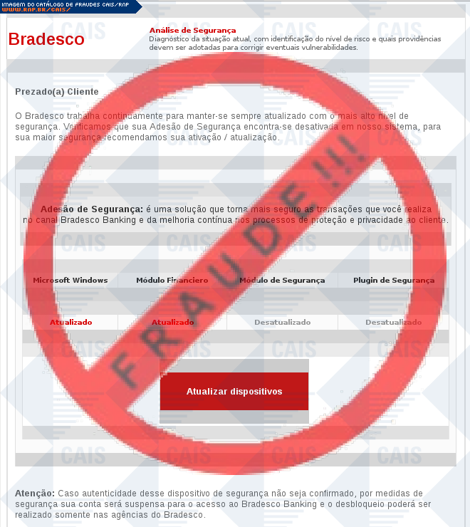 | comentário | A vítima recebe uma mensagem informando que sua adesão de segurança encontra-se desativada no sistema do banco Bradesco estando o link para atualizar os dispositivos disponível para download. No entanto o arquivo originado é malicioso criado para roubar informações... (leia mais) | |