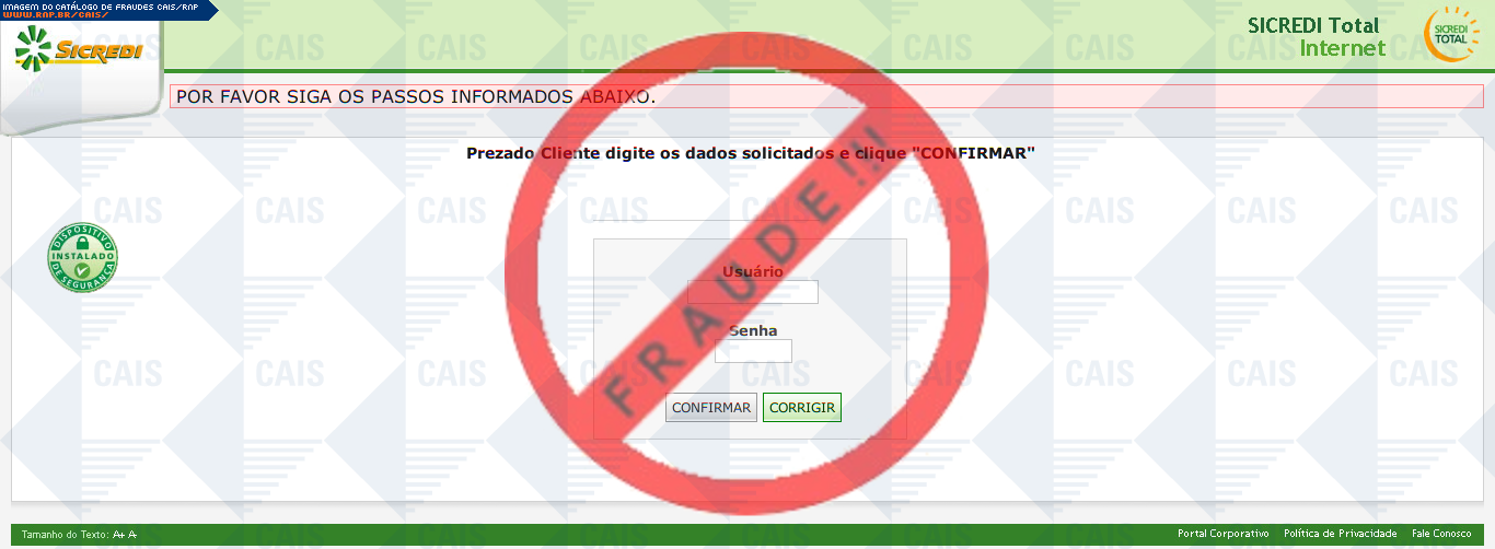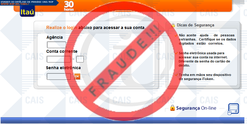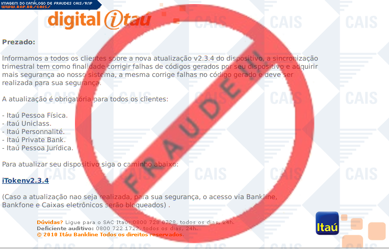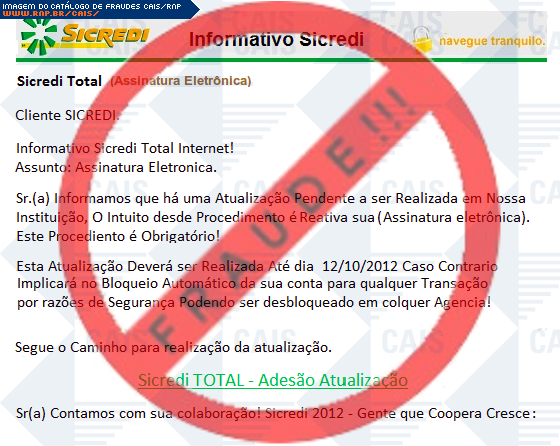 Esta página tem função informativa e educativa. Exibe uma coleção de imagens de phishing scam (fraudes eletrônicas) ou malware (código malicioso) veiculados por meio de spam (e-mail não-solicitado). Trata-se de conteúdo exemplificativo, não exaustivo, uma vez que não é possível contemplar todos os casos de fraudes existentes. Assim, caso você tenha conhecimento de um exemplar que não esteja aqui presente, isto não significa que não seja válido ou real. Inclusive incentivamos que você o envie para análise do CAIS para que, se for o caso, passe a integrar o nosso acervo.