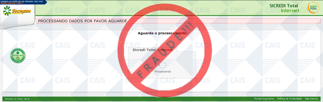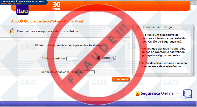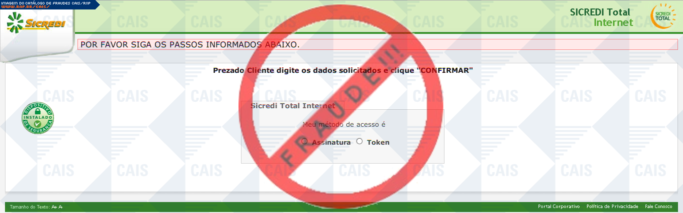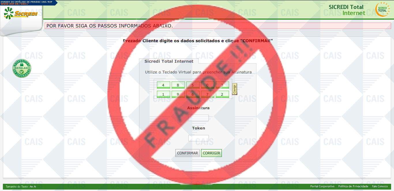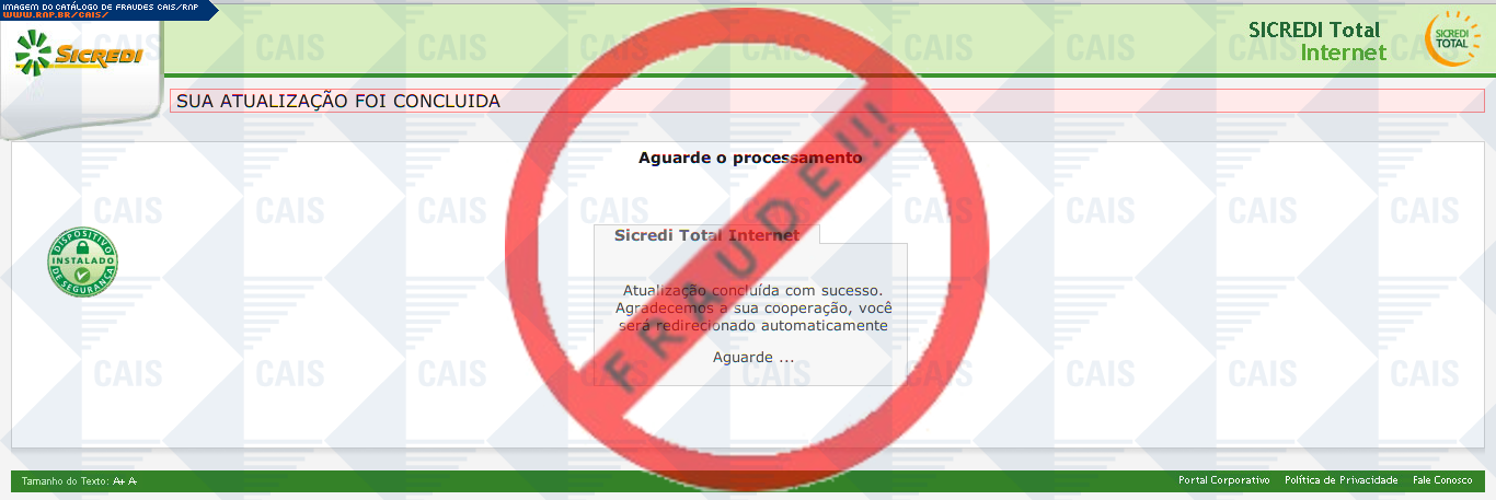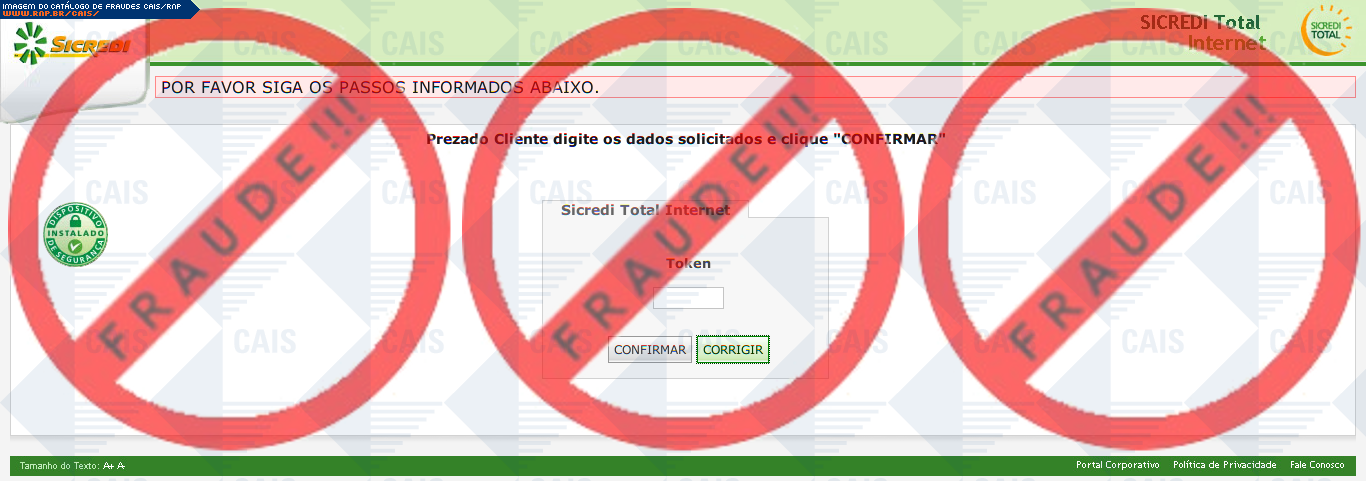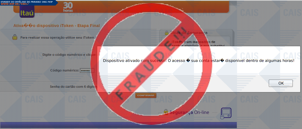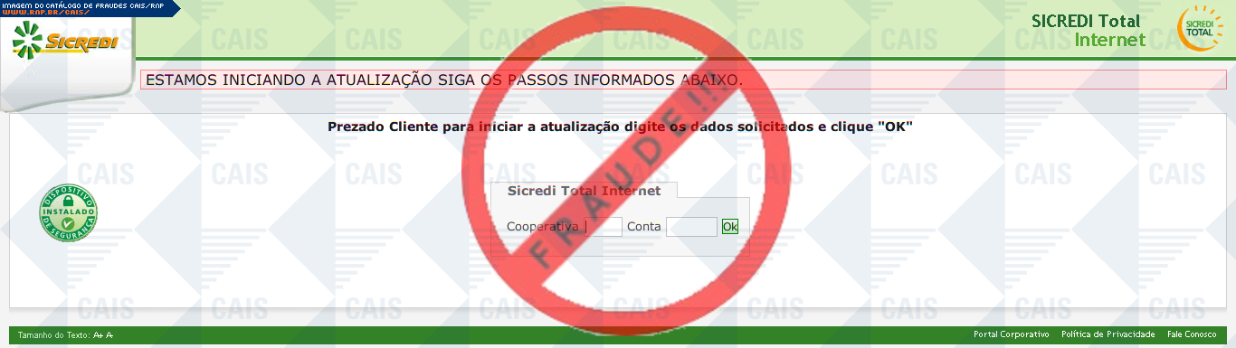 | comentário | Nessa fraude, uma mensagem é enviada a usuario em nome de uma instituição financeira informando da necessidade de atualização do acessos de segurança a acesso aos serviços online, mas ao clicar no link para atualização o usuario é direcionado a uma pagina... (leia mais) | |