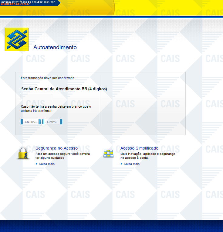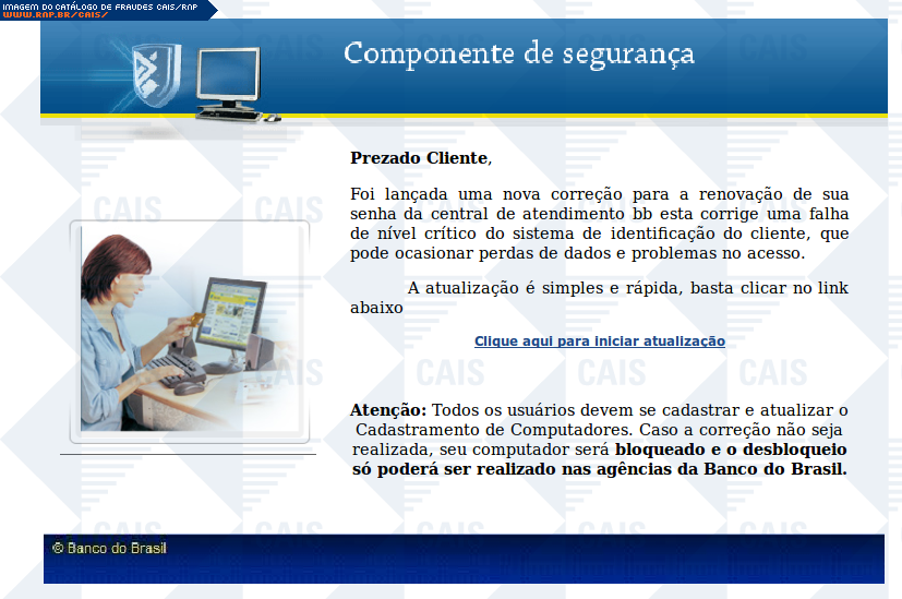 | comentário | A mensagem, em nome do Banco do Brasil, informa que a vítima deve realizar a nova correção para a renovação da senha da central de segurança. O link para a suposta atualização leva a uma página falsa, destinada a roubar dados da conta bancária da vítima. | |