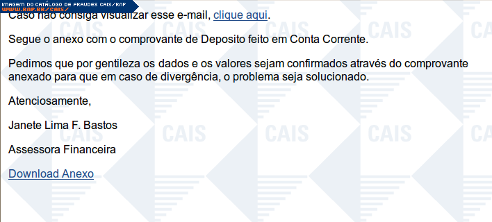 Esta página tem função informativa e educativa. Exibe uma coleção de imagens de phishing scam (fraudes eletrônicas) ou malware (código malicioso) veiculados por meio de spam (e-mail não-solicitado). Trata-se de conteúdo exemplificativo, não exaustivo, uma vez que não é possível contemplar todos os casos de fraudes existentes. Assim, caso você tenha conhecimento de um exemplar que não esteja aqui presente, isto não significa que não seja válido ou real. Inclusive incentivamos que você o envie para análise do CAIS para que, se for o caso, passe a integrar o nosso acervo.