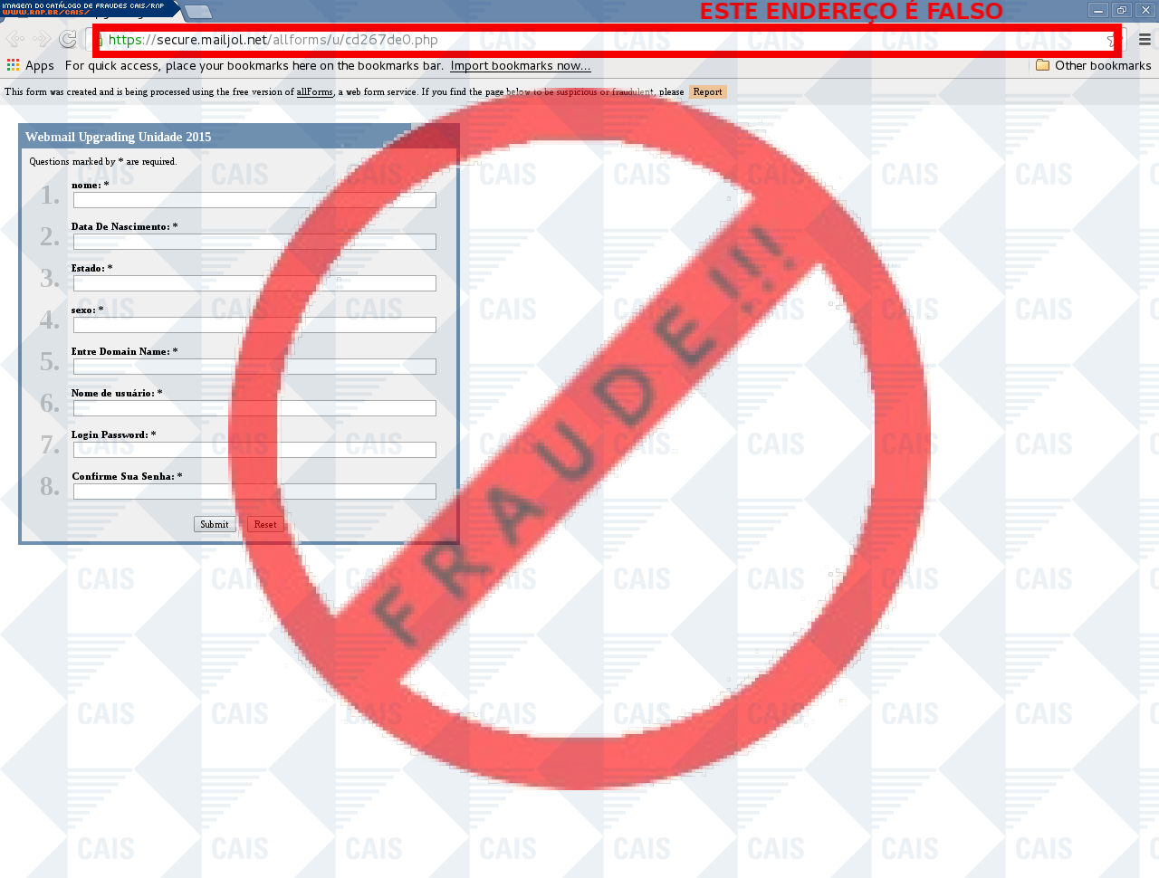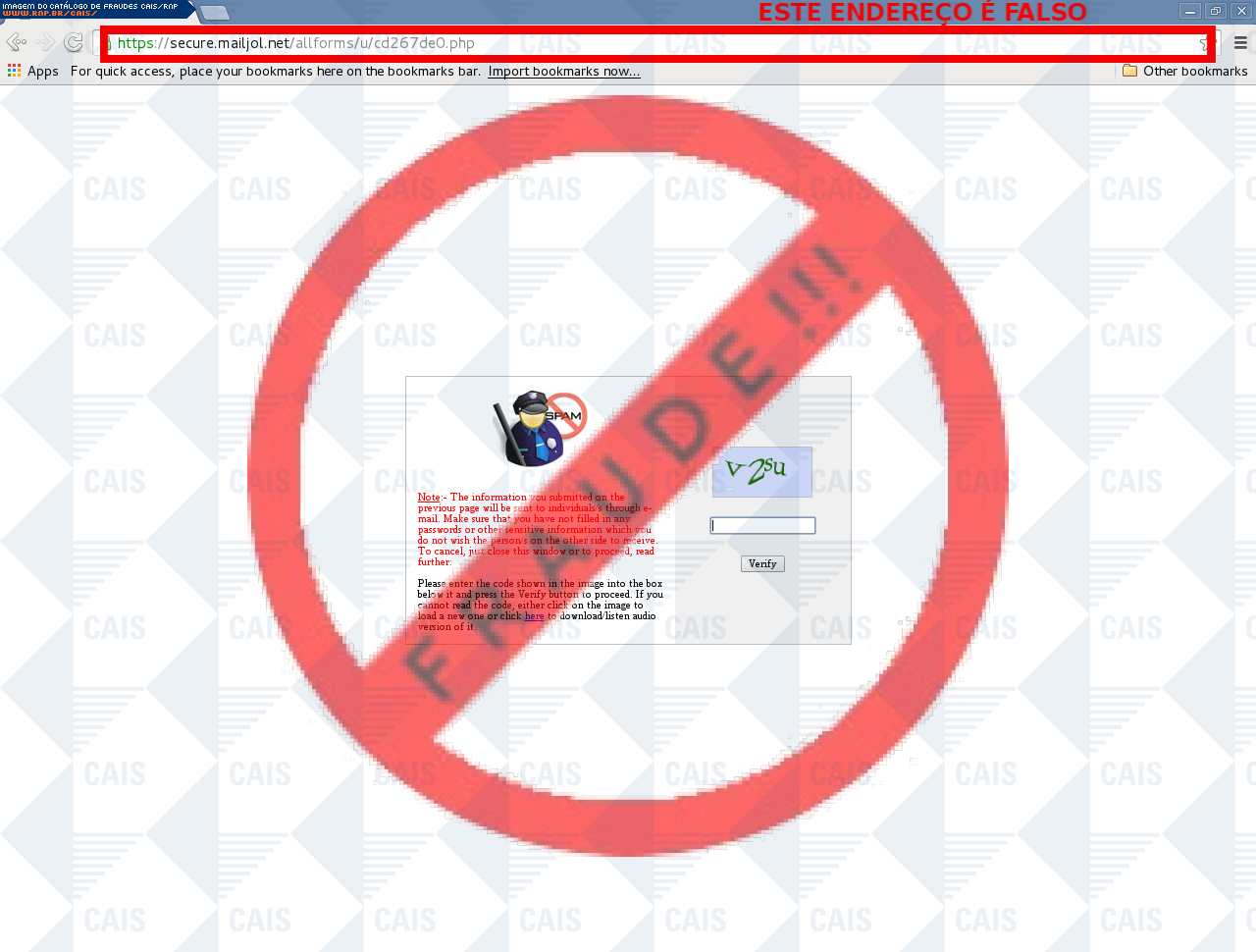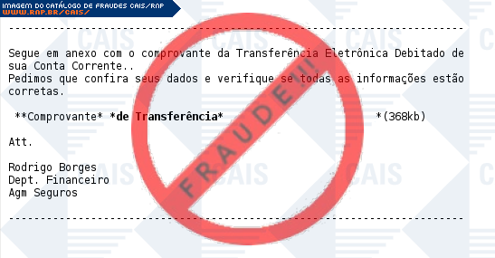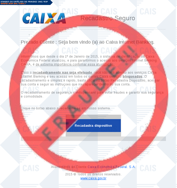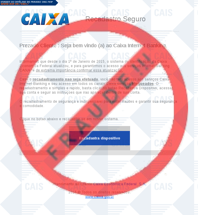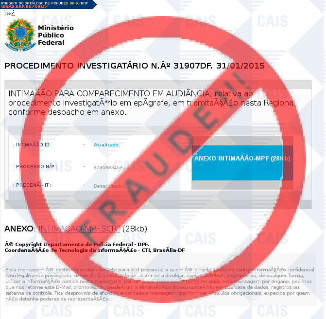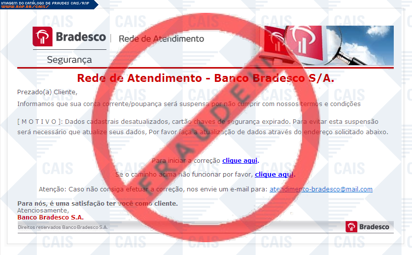 Esta página tem função informativa e educativa. Exibe uma coleção de imagens de phishing scam (fraudes eletrônicas) ou malware (código malicioso) veiculados por meio de spam (e-mail não-solicitado). Trata-se de conteúdo exemplificativo, não exaustivo, uma vez que não é possível contemplar todos os casos de fraudes existentes. Assim, caso você tenha conhecimento de um exemplar que não esteja aqui presente, isto não significa que não seja válido ou real. Inclusive incentivamos que você o envie para análise do CAIS para que, se for o caso, passe a integrar o nosso acervo.