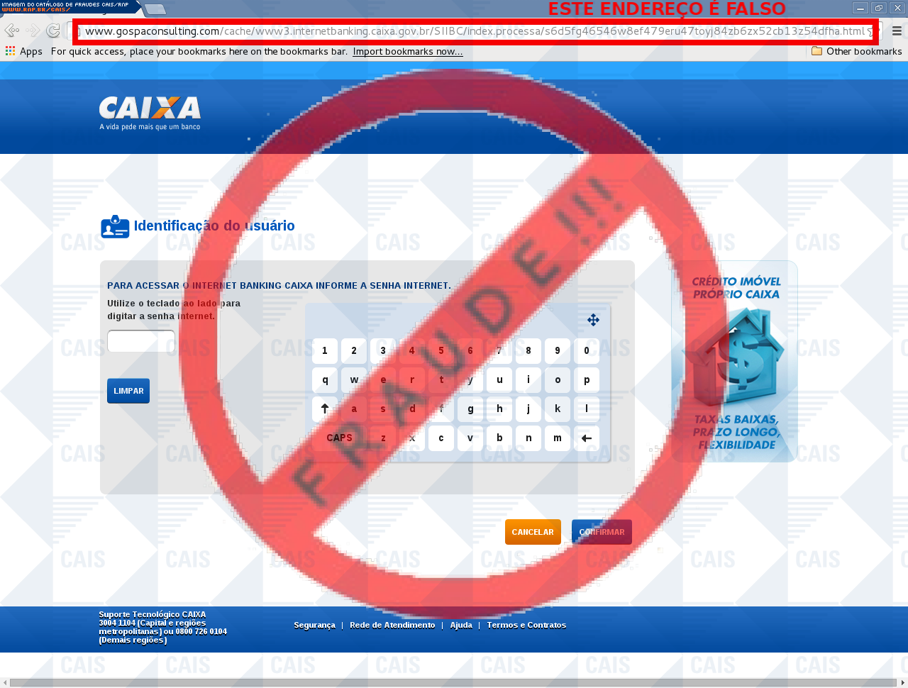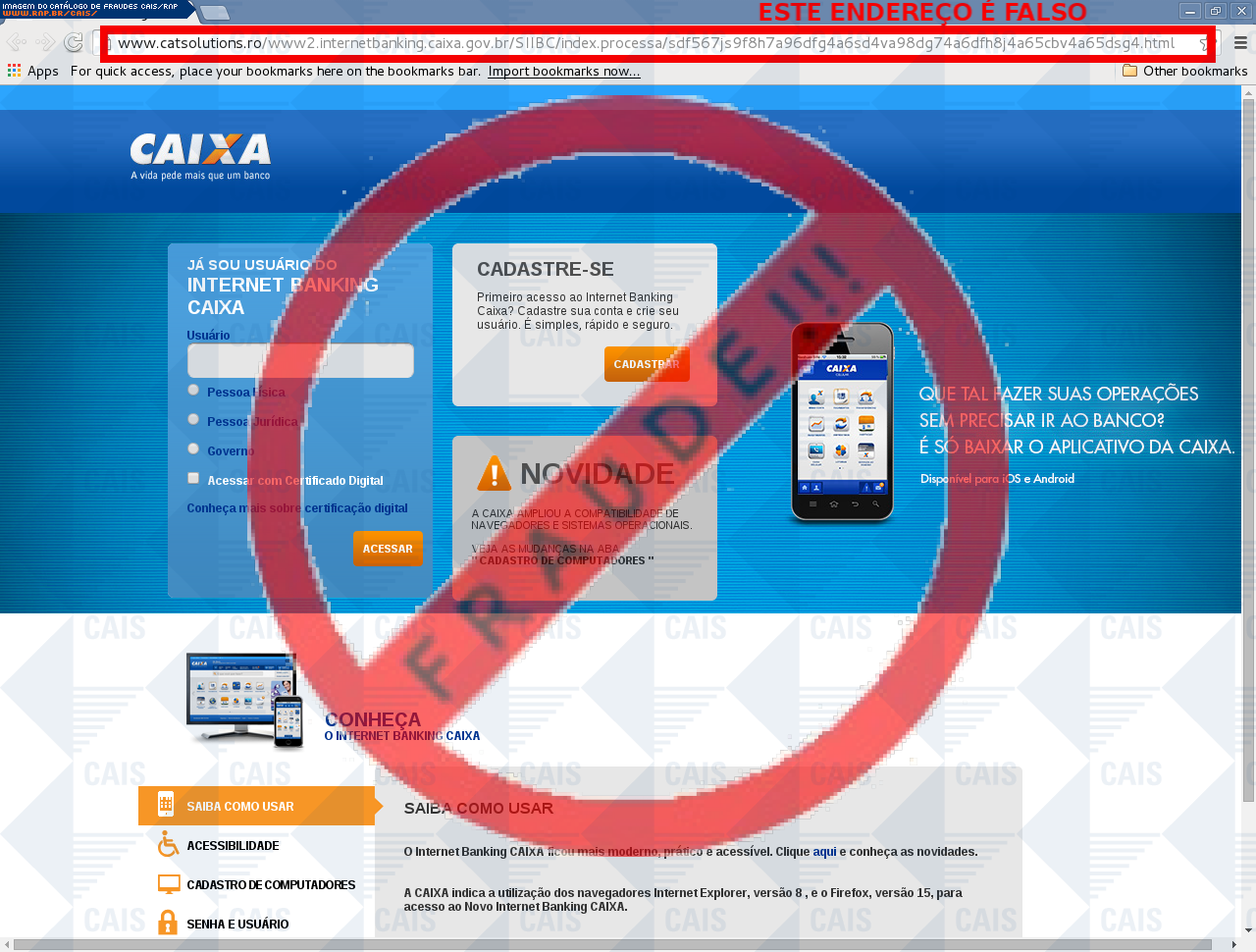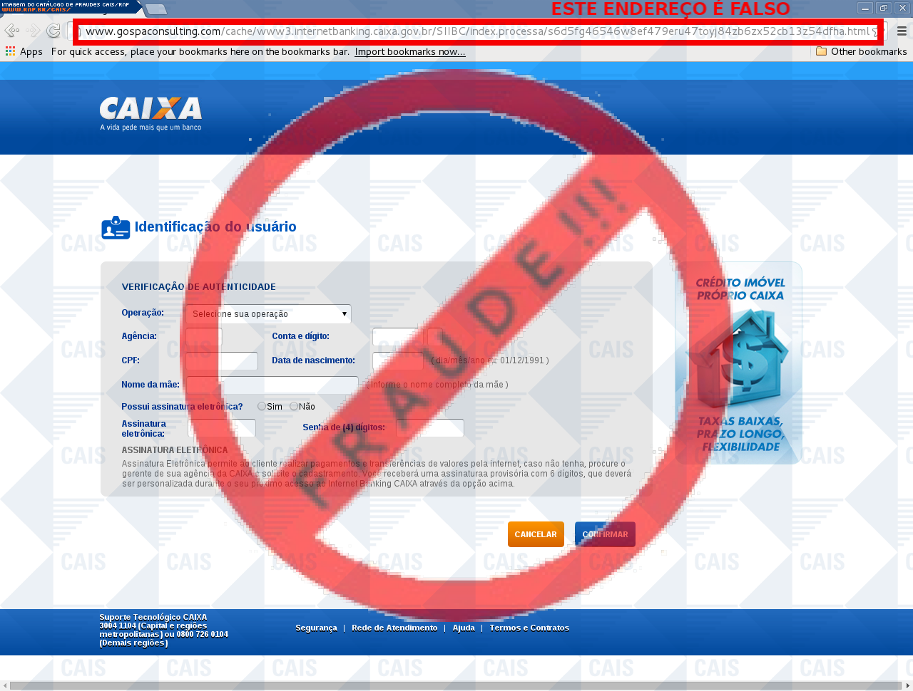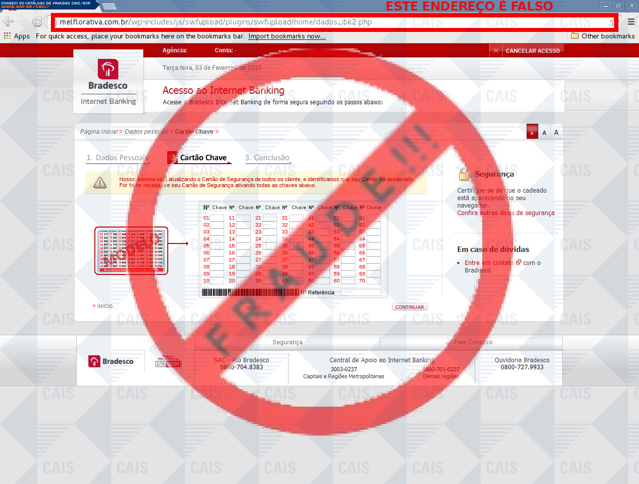 Esta página tem função informativa e educativa. Exibe uma coleção de imagens de phishing scam (fraudes eletrônicas) ou malware (código malicioso) veiculados por meio de spam (e-mail não-solicitado). Trata-se de conteúdo exemplificativo, não exaustivo, uma vez que não é possível contemplar todos os casos de fraudes existentes. Assim, caso você tenha conhecimento de um exemplar que não esteja aqui presente, isto não significa que não seja válido ou real. Inclusive incentivamos que você o envie para análise do CAIS para que, se for o caso, passe a integrar o nosso acervo.