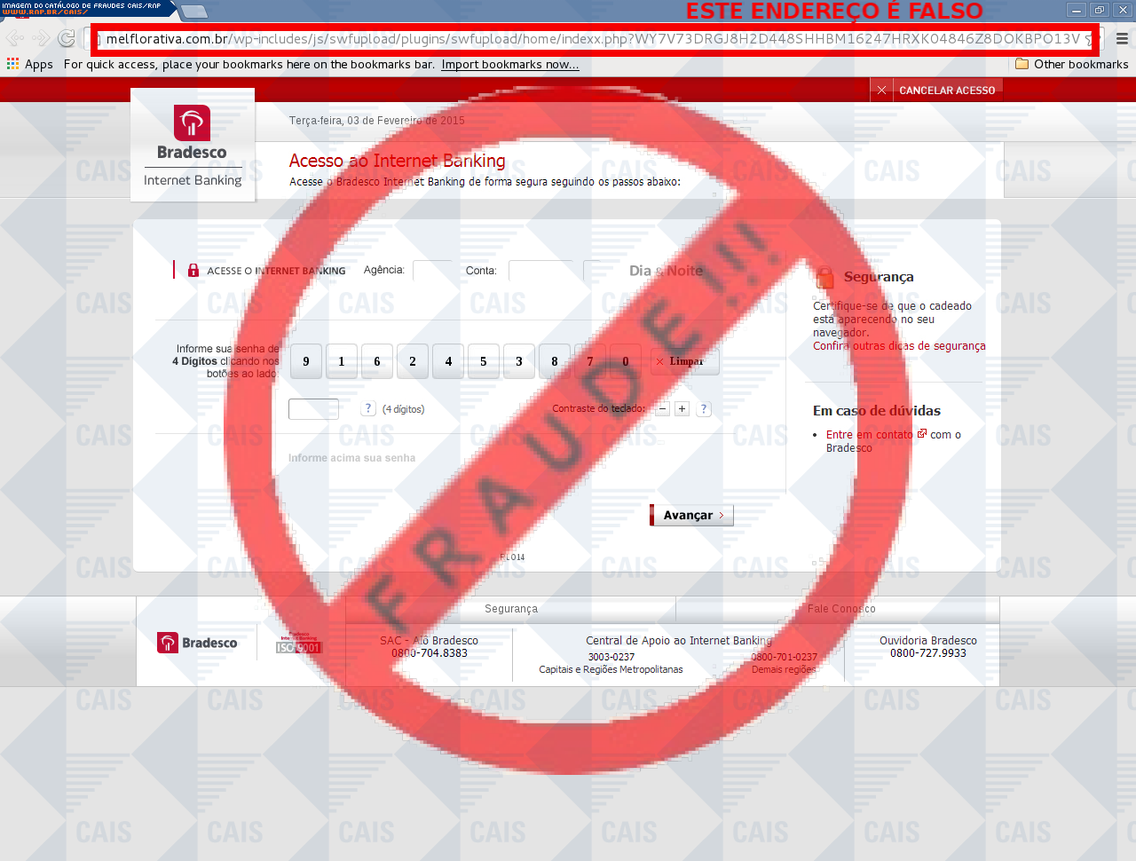 |   |  Fraudes identificadas e divulgadas pelo CAISA partir de 2008, todas as fraudes identificadas pelo CAIS estão sendo ordenadas de acordo com a data de distribuição e disponibilizadas para consulta, com o intuito de conscientizar a comunidade sobre os principais golpes que estão em circulação. Adicionalmente, o CAIS envia alertas de segurança através da lista CAIS Alerta quando uma fraude mostra-se particularmente perigosa aos usuários de computadores. Reporte fraudes: