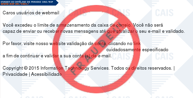 | comentário | O usuário recebe uma mensagem informando que sua conta de e-mail excedeu o limite de armazenamento sendo necessário realizar uma atualização no link indicado, no entanto a página é falsa criada para roubar os dados de login da vítima. | |