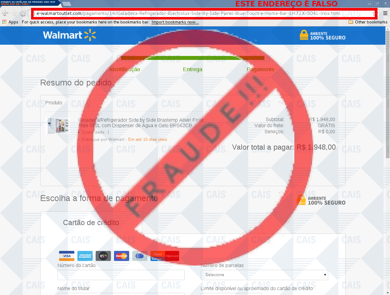 | comentário | A vítima recebe um e-mail informando sobre promoções no site de compra da Walmart disponibilizando link de vários produtos em desconto, no entanto a página é falsa destinada a roubar as informações pessoais e do cartão do usuário. | |