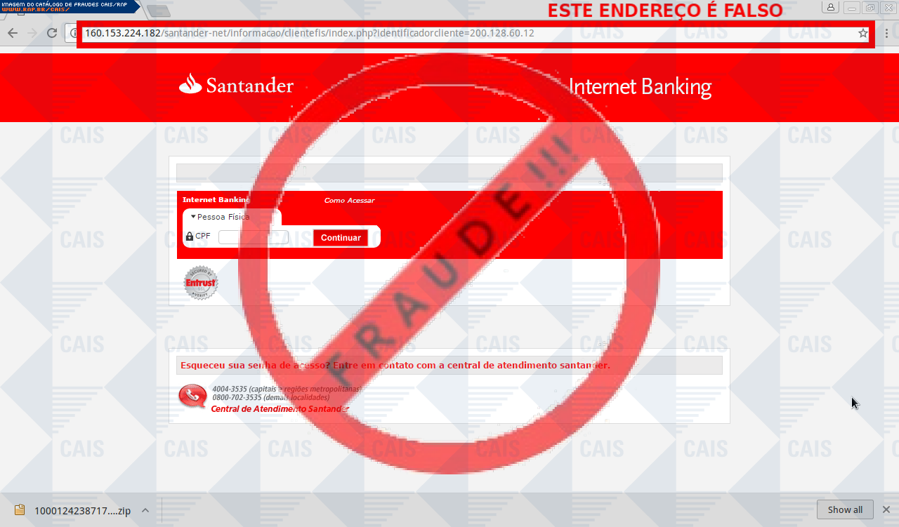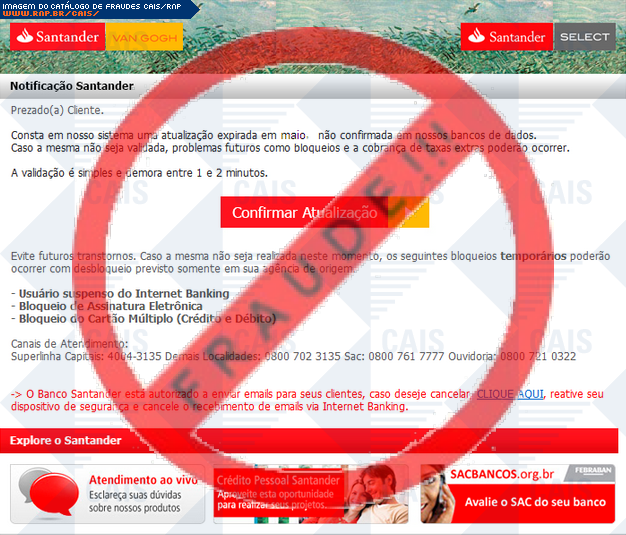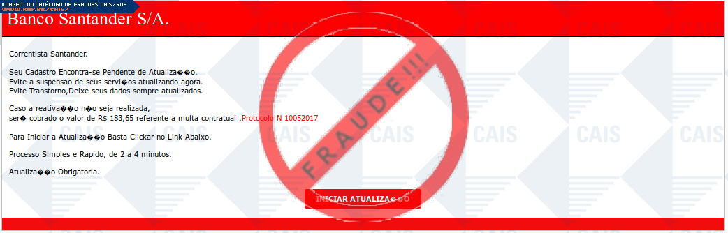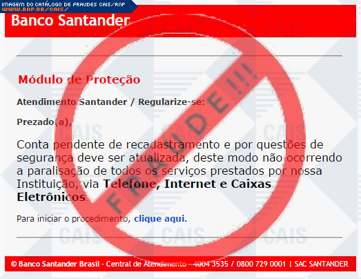 Esta página tem função informativa e educativa. Exibe uma coleção de imagens de phishing scam (fraudes eletrônicas) ou malware (código malicioso) veiculados por meio de spam (e-mail não-solicitado). Trata-se de conteúdo exemplificativo, não exaustivo, uma vez que não é possível contemplar todos os casos de fraudes existentes. Assim, caso você tenha conhecimento de um exemplar que não esteja aqui presente, isto não significa que não seja válido ou real. Inclusive incentivamos que você o envie para análise do CAIS para que, se for o caso, passe a integrar o nosso acervo.